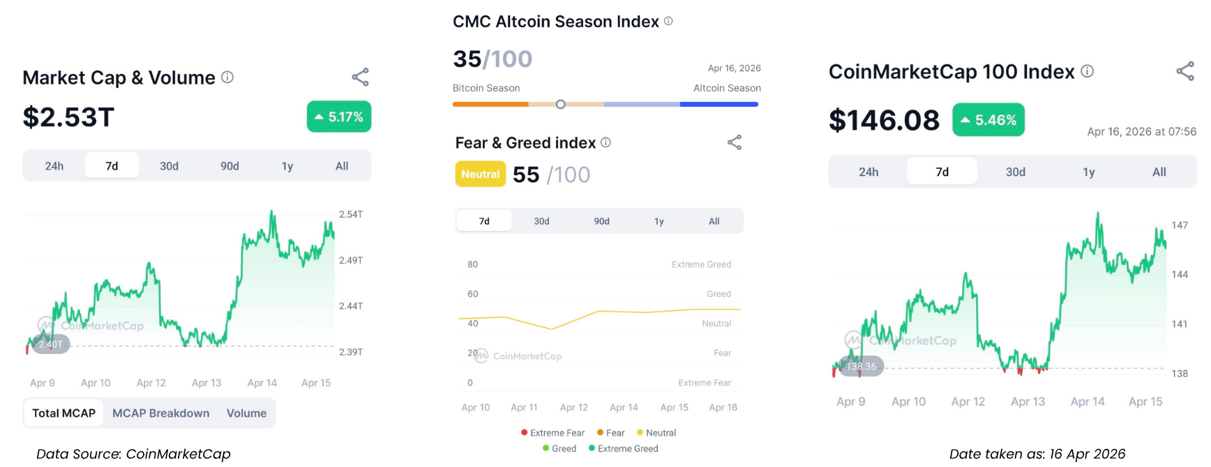 Momentum bullish kembali mewarnai pasar kripto pekan ini dengan lonjakan yang sangat impresif. Arus dana segar yang masuk secara masif berhasil mendongkrak Market Cap & Volume hingga menembus angka $2.53 Triliun (+5.17%). Senada dengan hal tersebut, CoinMarketCap 100 Index juga naik ke level $146.08 (+5.46%).