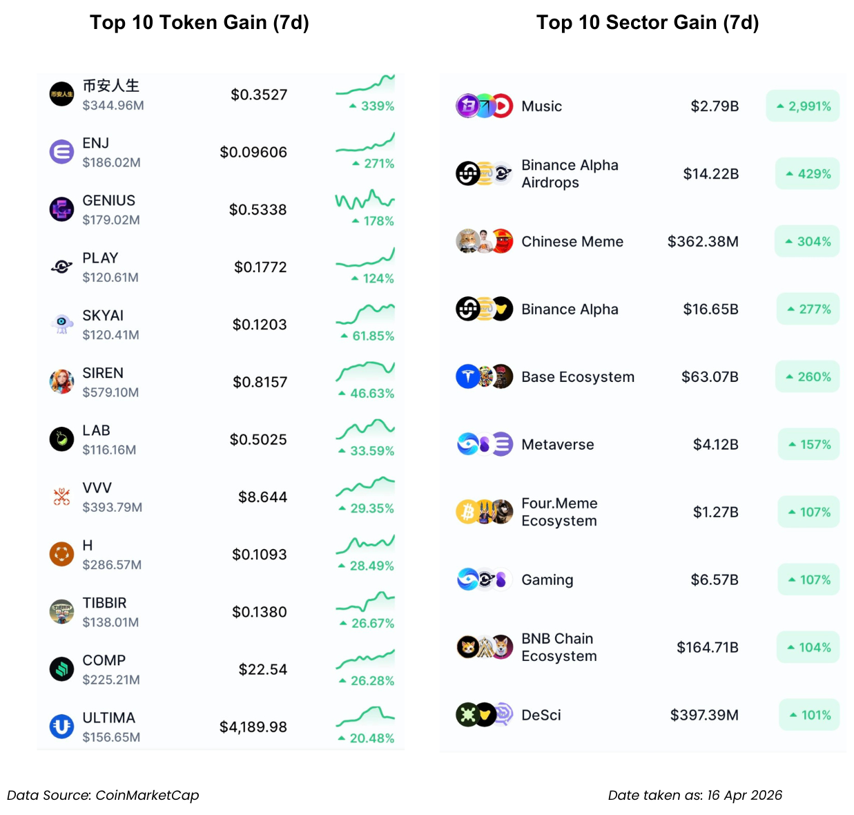 - Sektor Music (+2,991%) dan Binance Alpha Airdrops (+429%) memimpin tren, menggeser fokus pasar ke narasi hiburan digital dan perburuan program airdrop dari ekosistem bursa utama. Token 币安人生 mencatat kenaikan tertinggi sebesar (+339%), disusul oleh lonjakan pada ENJ (+271%) dan GENIUS (+178%).