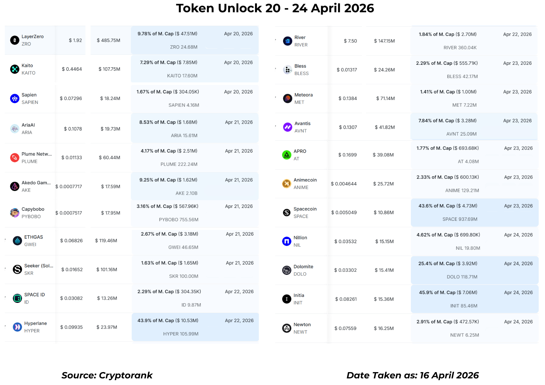 - 🟡 Unlock Menengah (5–10% dari Kapitalisasi Pasar): Di zona kuning ini, pantau ketat raksasa omnichain LayerZero (ZRO) yang akan mencairkan 9.78% suplai dengan nilai nominal mencapai $47.51 juta pada 20 April. Nama lain yang perlu diawasi adalah Akedo Games (AKE) dengan 9.25% pada 21 April, serta AriaAI (ARIA) dan Avantis (AVNT) yang masing-masing merilis di rentang 7-8%.
