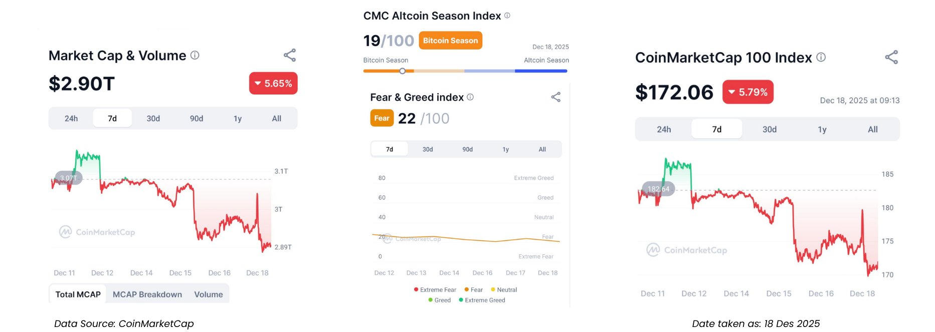 - Pasar kripto kembali mengalami tekanan jual yang signifikan minggu ini, Market Cap turun ke level $2.90 triliun (-5.65%) dan menekan CMC 100 Index hingga ke $172.06 (-5.79%). Fear & Greed Index yang tertahan di angka 22, menegaskan bahwa pasar masih terjebak dalam zona ‘Fear’ (Ketakutan).