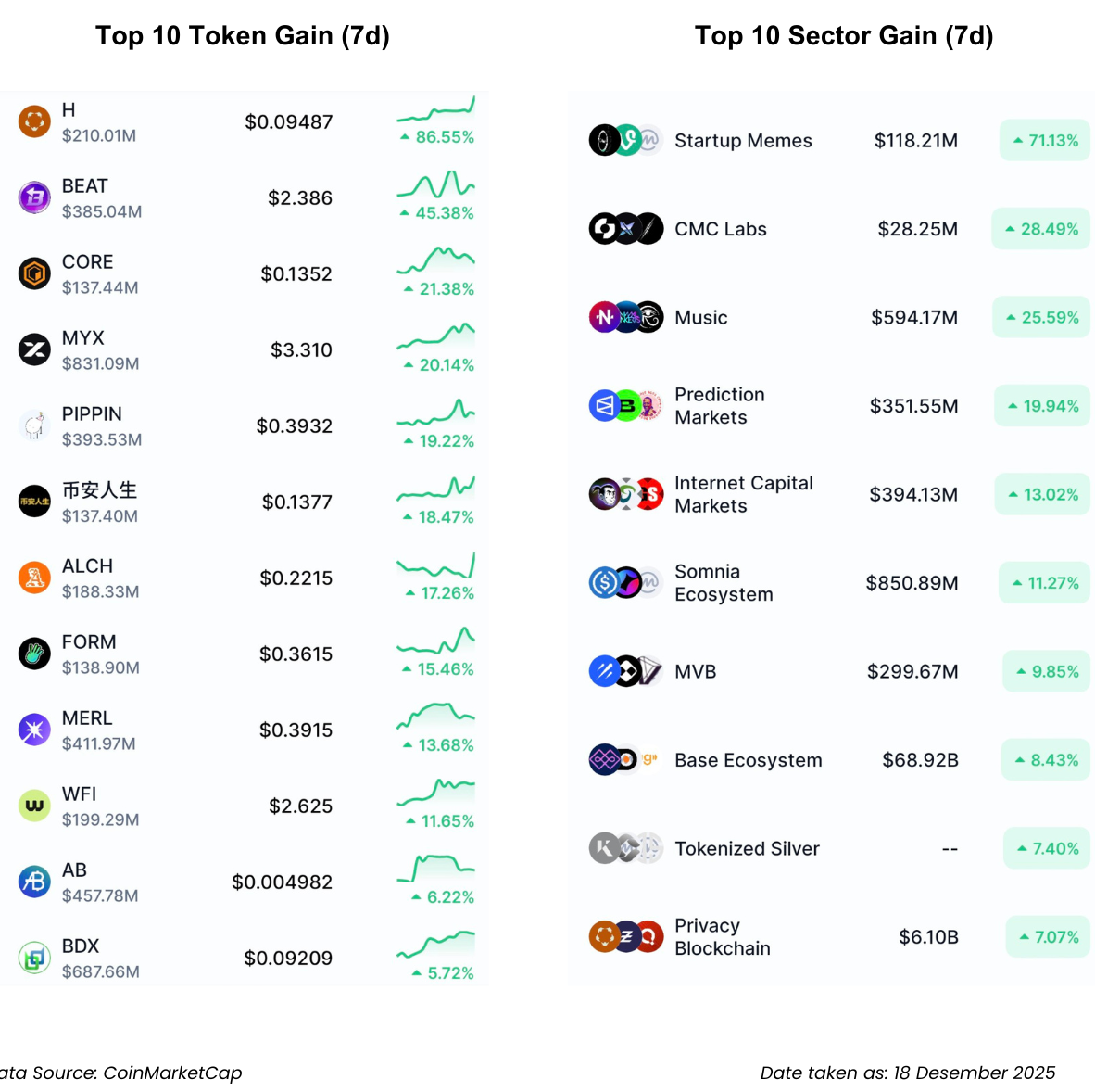 - Sektor Startup Memes (+71.13%) dan CMC Labs (+28.49%) mendominasi, menandakan fokus pasar yang agresif pada spekulasi meme tahap awal dan proyek yang infrastruktur.