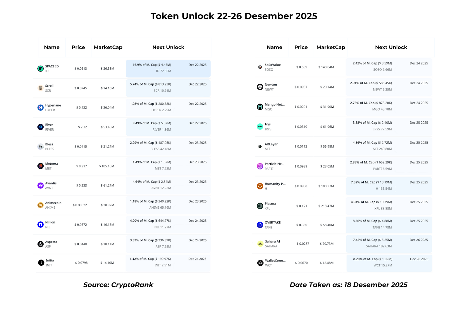 Menjelang akhir tahun di pekan perayaan Natal (22-26 Desember), pasar kripto akan diramaikan oleh pelepasan token dari 22 proyek. Berbeda dengan minggu sebelumnya yang sepi, pekan ini volume antrian proyek cukup padat, mulai dari kategori bluechip hingga low cap, yang siap menyuntikkan likuiditas baru ke pasar.