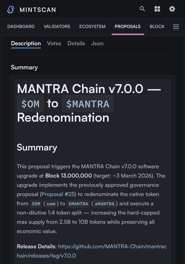 Mantra Chain merilis proposal tata kelola untuk upgrade software v7.0.0 pada blok 13.000.000 (target 3 Maret). Upgrade ini mencakup redenominasi token asli (OM ke MANTRA) dengan rasio split 1:4, meningkatkan suplai maksimal dari 2,5Miliar menjadi 10Miliar token tanpa mendilusi nilai ekonomi. Redenominasi ini adalah langkah strategis untuk meningkatkan likuiditas dan psikologi pasar (unit-bias).