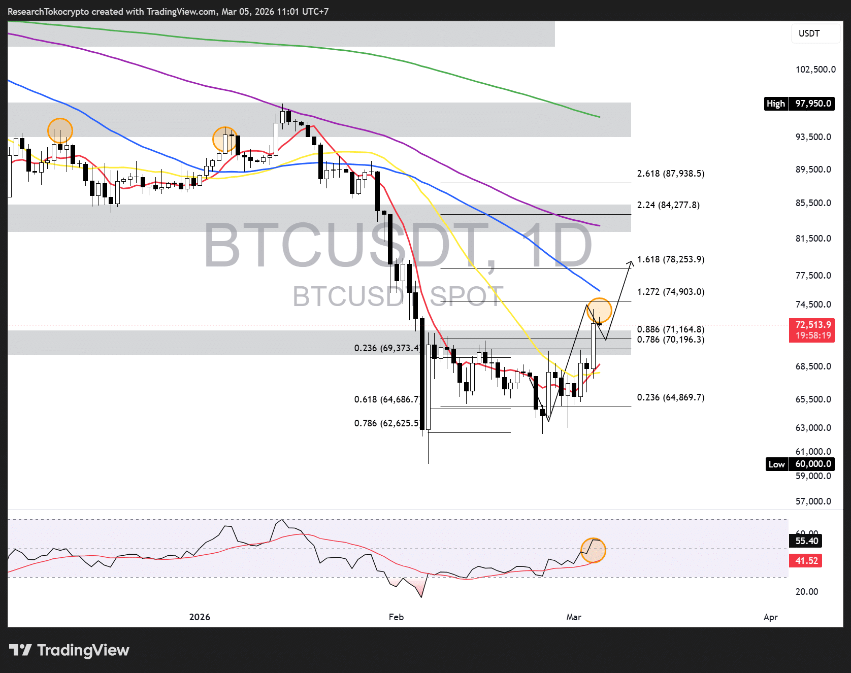 โ Harga Bitcoin pada timeframe daily berhasil breakout dan diprediksi bisa lanjut hingga Fibonacci Extension 1.618 (78,253)
