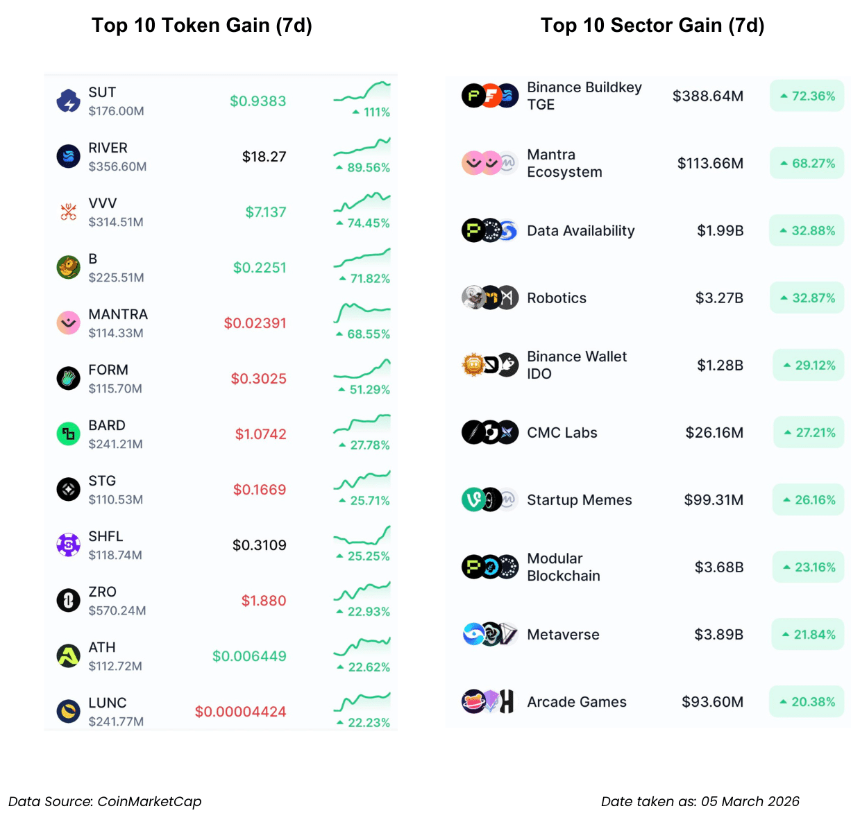 - Sektor Binance Buildkey TGE (+72.36%) dan Mantra Ecosystem (+68.27%) memimpin tren, menggeser fokus pasar ke narasi ekosistem bursa dan aset dunia nyata (RWA). Token SUT mencatat kenaikan tertinggi sebesar (+111%), disusul oleh lonjakan pada RIVER (+89.56%) dan VVV (+74.45%).