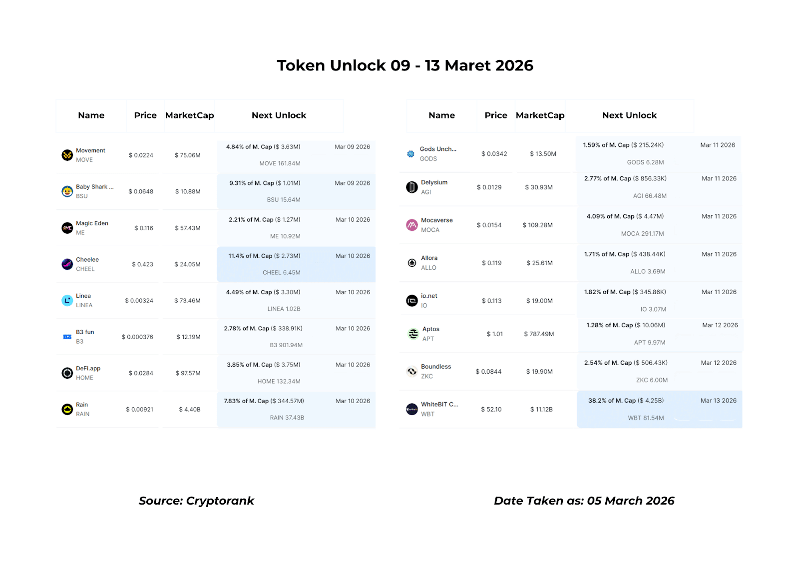 Token Unlock (09โ13 Maret 2026)