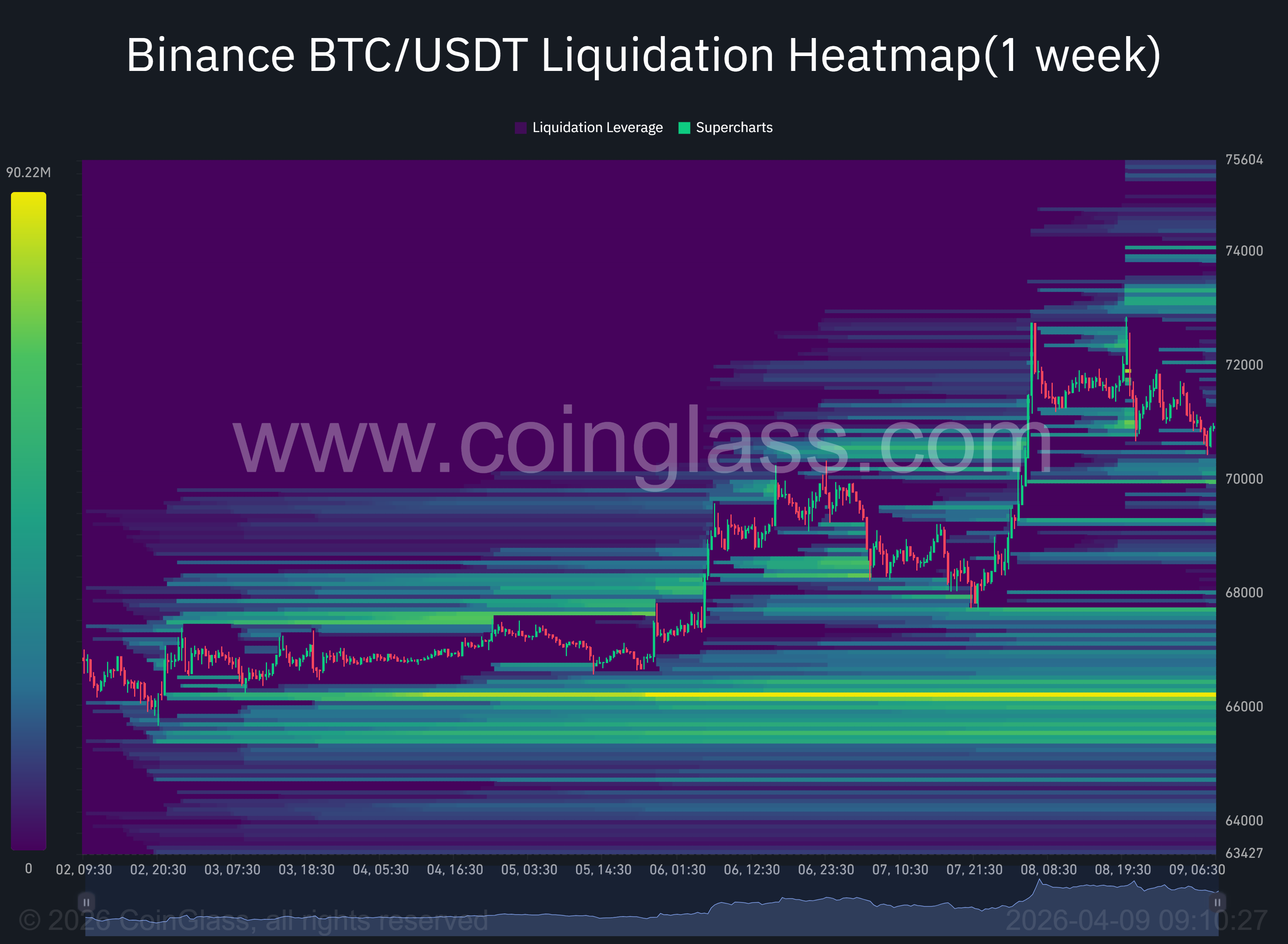 - Support Bawah ($66.000): Terpantau garis kuning yang sangat terang dan tebal tertinggal di bawah, tepat di level $66.000. Kumpulan likuiditas posisi Long yang masif ini adalah area paling padat saat ini. Level ini bisa bertindak sebagai magnet kuat yang menarik harga turun jika terjadi koreksi, sekaligus menjadi bantalan support yang sangat solid.
