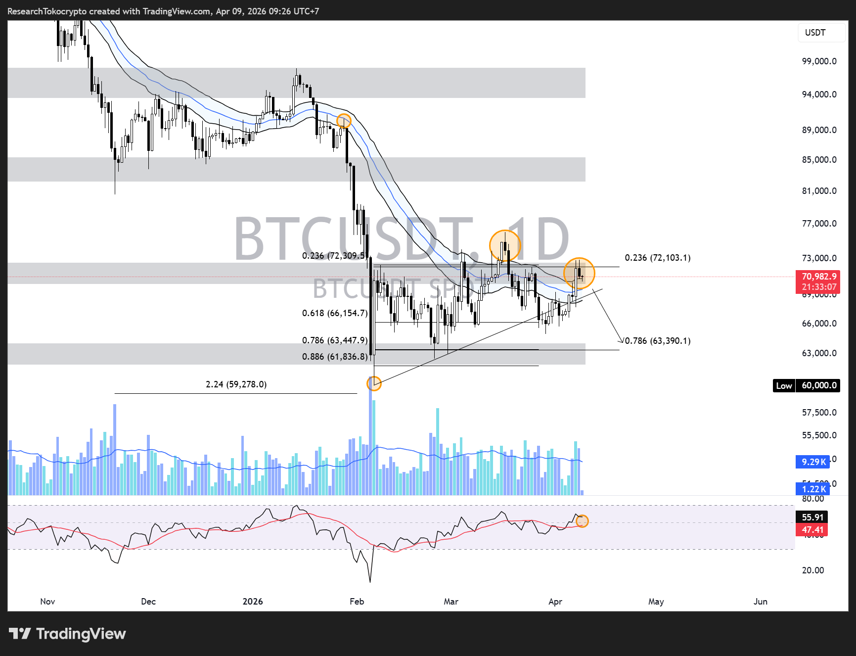 Secara timeframe weekly, harga menunjukkan berlawanan, meski masi tertahan di Resistance $72K, apabila mingguan ditutup dengan full hijau, maka harga bisa retrace hingga Fibonacci Retracement 0.5 (79,051) didukung dengan angka RSI yang berada di atas angka 50 dan sudah crossing. Artinya, secara jangka panjang Bitcoin bisa kembali Bullish dengan timeframe weekly yang lebih reasonable, tetapi secara jangka pendek, Bitcoin bisa kembali turun hingga Fibonacci yang telah dimention.