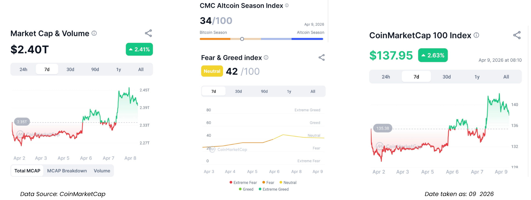 - Market Cap & Volume mencatatkan pemulihan ke angka $2.40 Triliun (+2.41%), sejalan dengan CoinMarketCap 100 Index yang menguat ke level $137.95 (+2.63%). Indikator Fear & Greed naik ke angka 42, menandakan kepanikan pasar mulai mereda dan sentimen kini perlahan memasuki zona ‘Neutral’ (Netral).