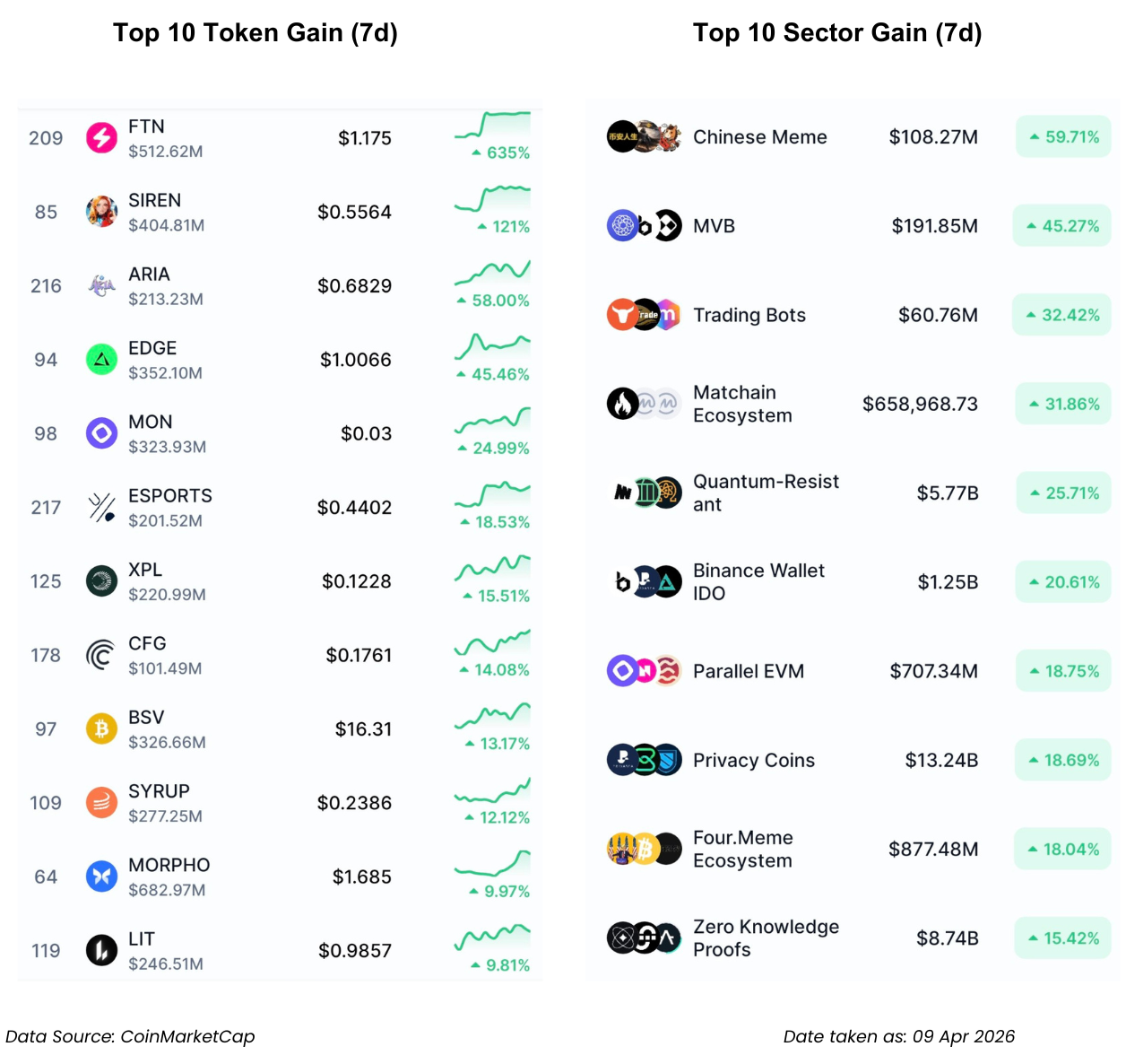 - Sektor Chinese Meme (+59.71%) dan MVB (+45.27%) memimpin tren, menggeser fokus pasar ke narasi spekulasi koin meme tematik dan program inkubasi proyek. Token FTN mencatat kenaikan tertinggi sebesar (+635%), disusul oleh lonjakan pada SIREN (+121%) dan ARIA (+58.00%).