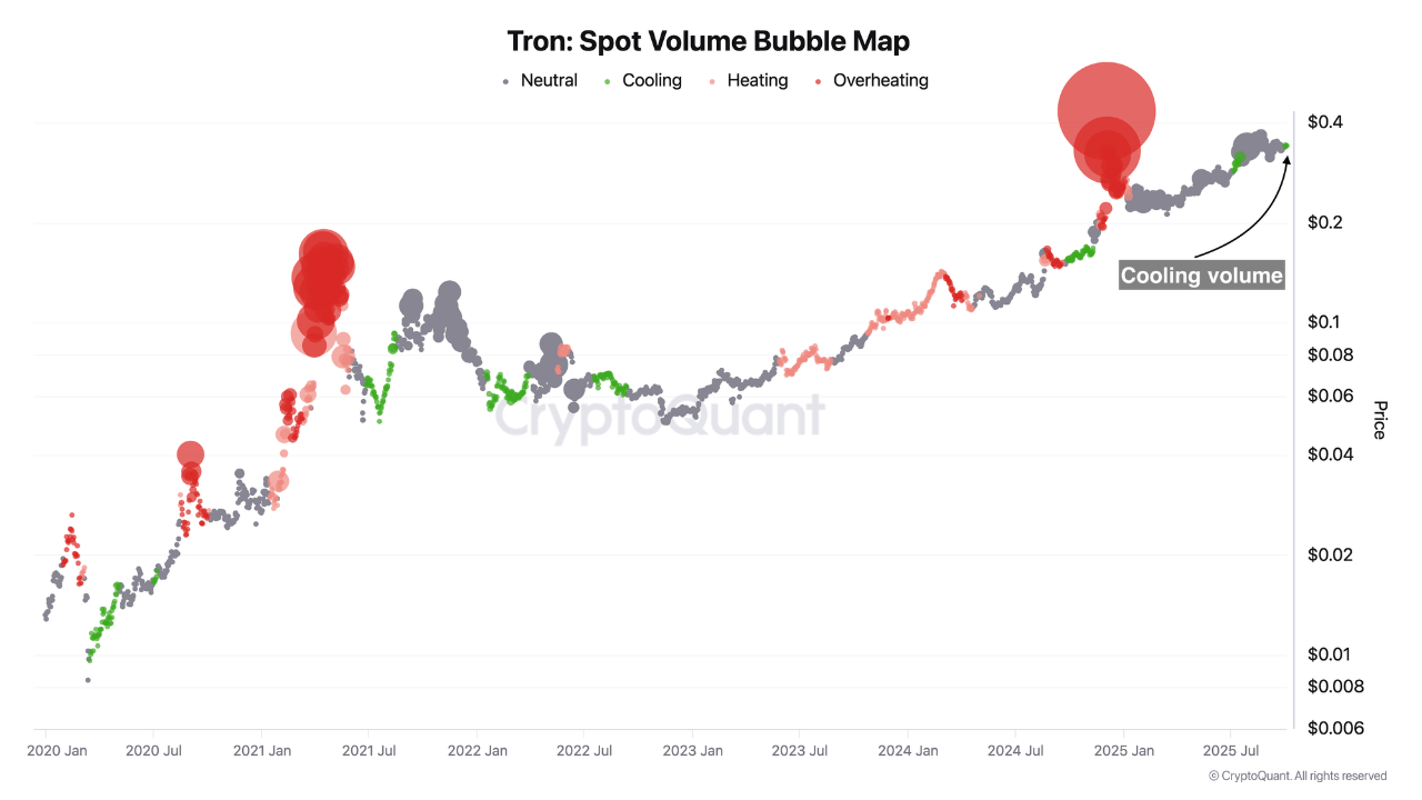 Data on-chain menunjukkan adanya “pendinginan” yang signifikan pada volume perdagangan TRON ($TRX). Penurunan volume ini digambarkan sebagai periode di mana “smart money” cenderung siap sementara minat pasar terhadap TRON sedang rendah.