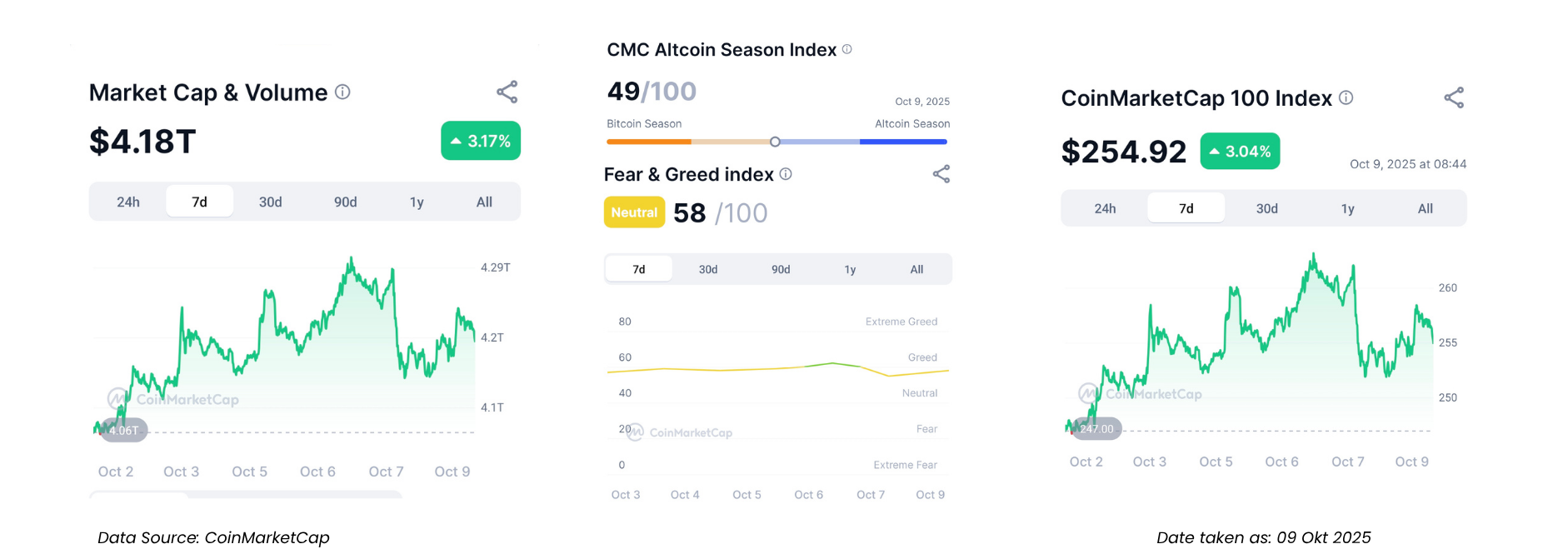 Sentimen optimis kembali mewarnai pasar kripto minggu ini, mendorong valuasi pasar secara keseluruhan. Market Cap & Volume naik ke $4.18 triliun (+3.17%), dengan CoinMarketCap 100 Index juga menguat ke $254.92 (+3.04%).