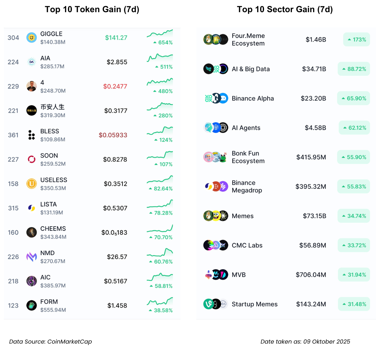 • Sektor Four.Meme Ecosystem (+173%) dan AI & Big Data (+88.72%) mendominasi, menandakan momentum kuat pada narasi spekulatif berbasis meme dan teknologi kecerdasan buatan.
