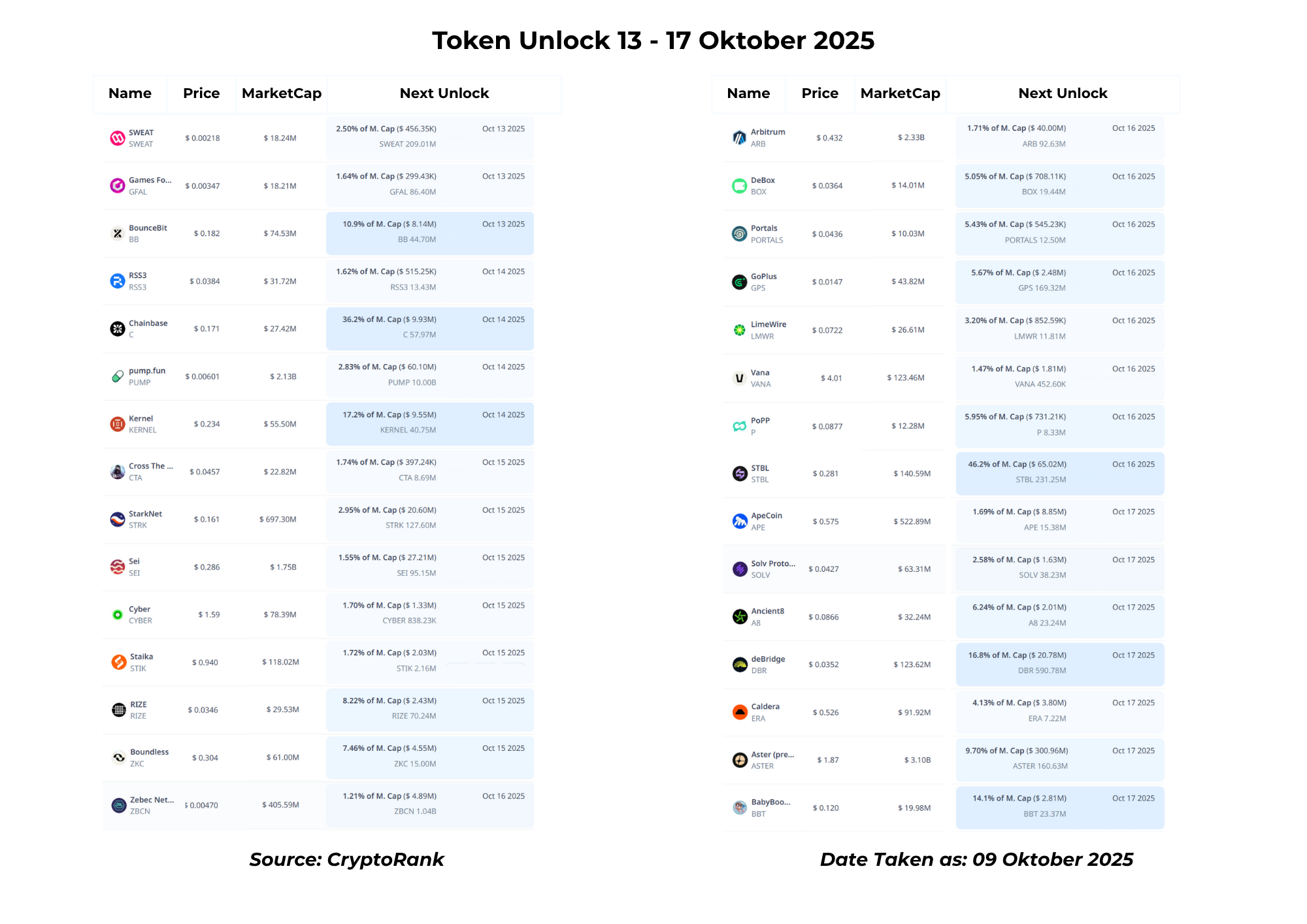 Memasuki pertengahan Oktober, jadwal unlock token untuk periode 13-17 Oktober dipenuhi oleh 30 proyek. Minggu ini patut diwaspadai karena beberapa proyek dijadwalkan melepas suplai dalam jumlah yang sangat besar, yang berpotensi menjadi katalis utama volatilitas pasar.
