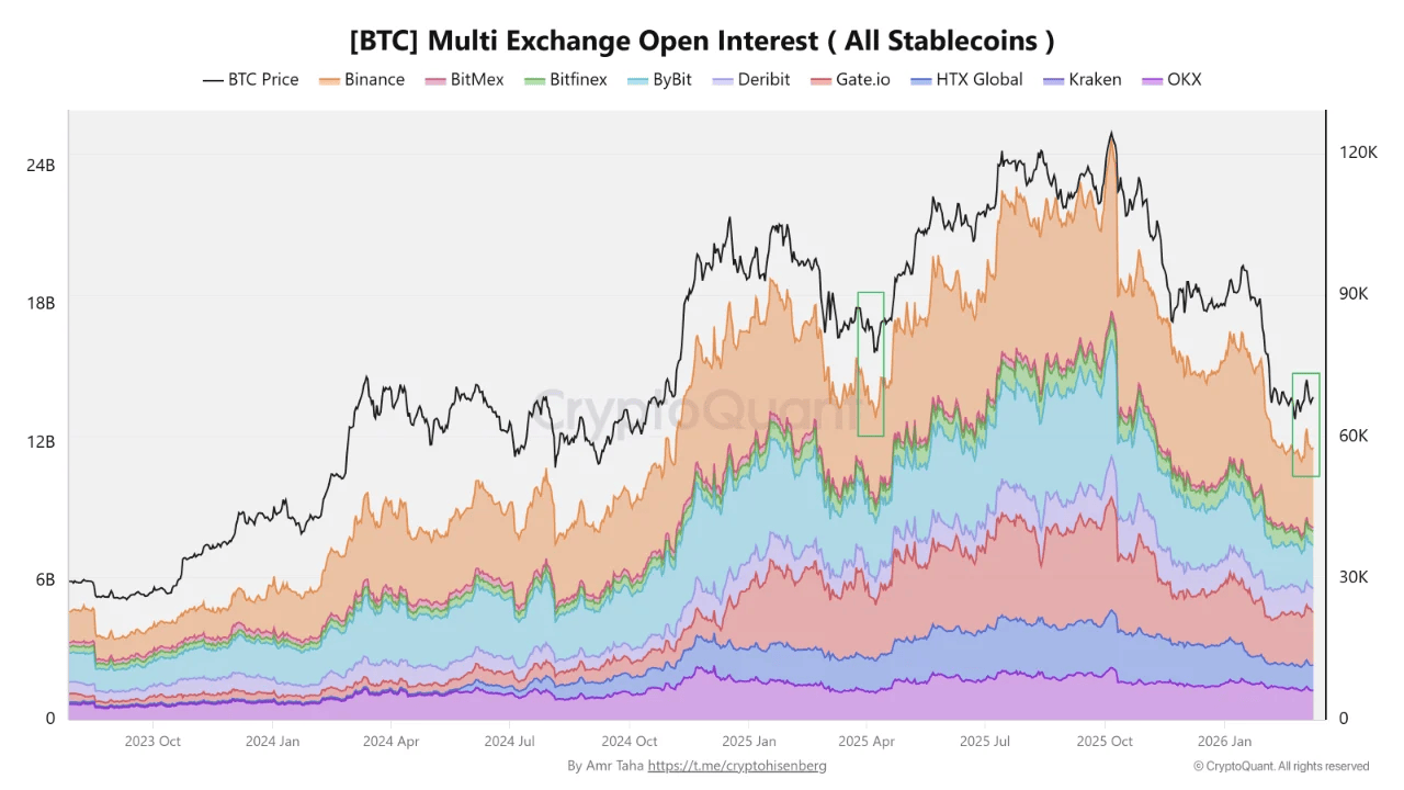 - Anjloknya Kontrak Aktif (Open Interest): Grafik memperlihatkan Open Interest (total kontrak perdagangan yang masih terbuka/aktif) anjlok secara serempak di hampir seluruh bursa besar. Khusus di bursa Binance, penurunan tajam ini membentuk pola yang sangat mirip dengan momen ketika Bitcoin berhasil membangun pijakan dasar (bottom) yang kuat pada bulan April 2025 lalu.