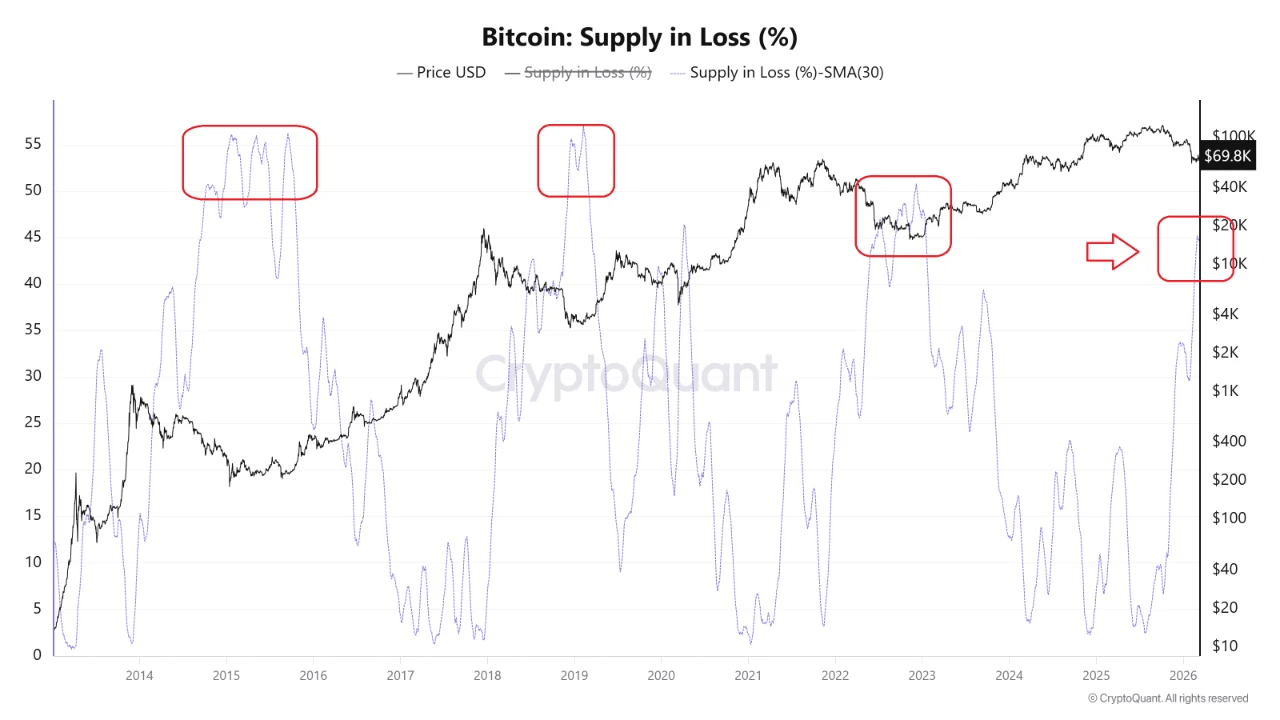 - Bitcoin: Supply in Loss (%) ➜ Melonjak ke area 40–45%