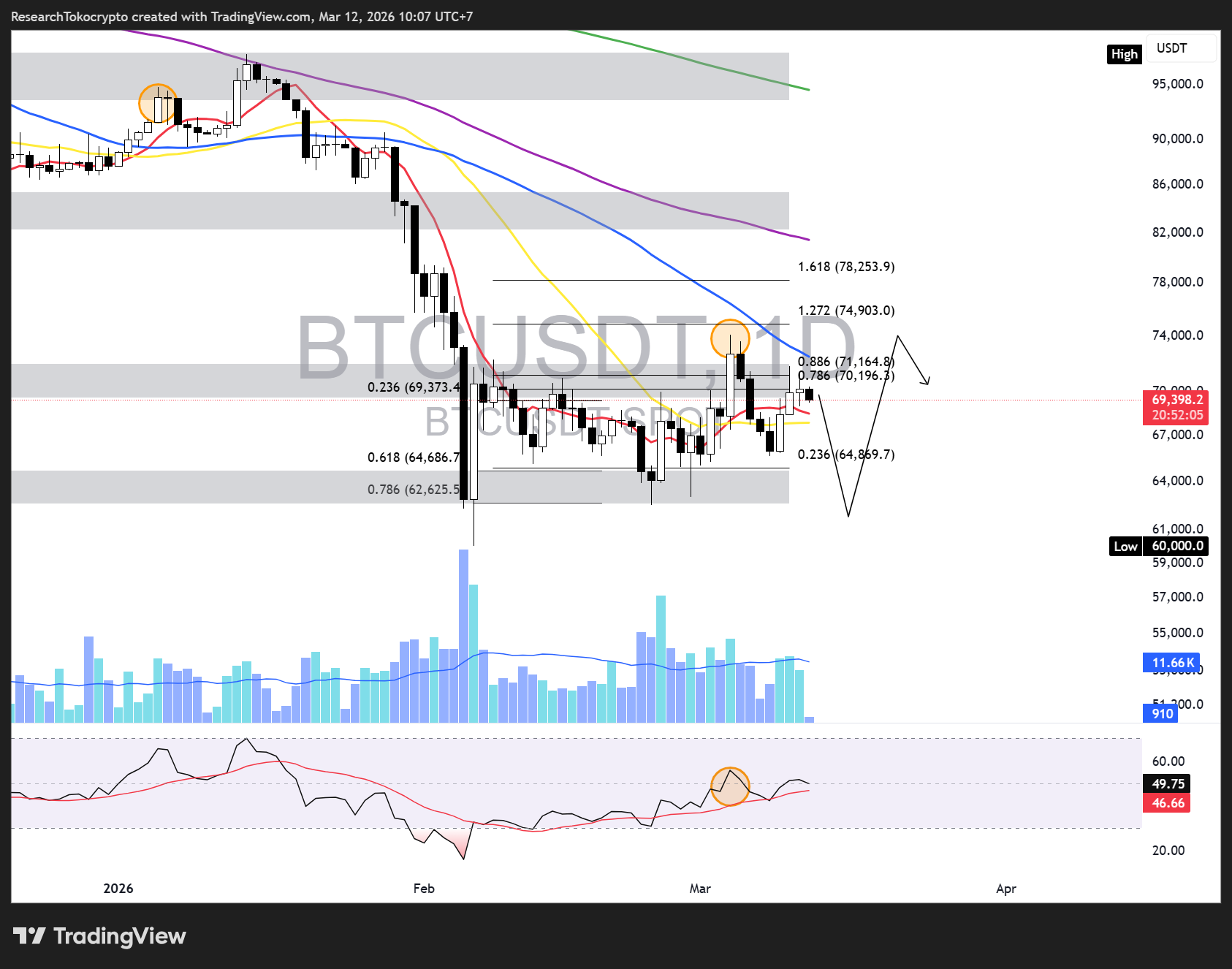 - Bearish case: Bitcoin kembali Sideways dalam keadaan yang tidak menentu arahnya dan dapat diprediksi kembali menurun hingga liquidity bawahnya pada Fibonacci Retracement 0.786 (62,625.5).