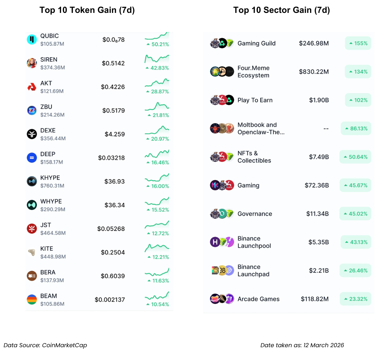 - Sektor Gaming Guild (+155%) dan Four.Meme Ecosystem (+134%) memimpin tren, menggeser fokus pasar ke narasi permainan berbasis kripto (GameFi) dan spekulasi koin meme. Token QUBIC mencatat kenaikan tertinggi sebesar (+50.21%), disusul oleh lonjakan pada SIREN (+42.83%) dan AKT (+28.87%).