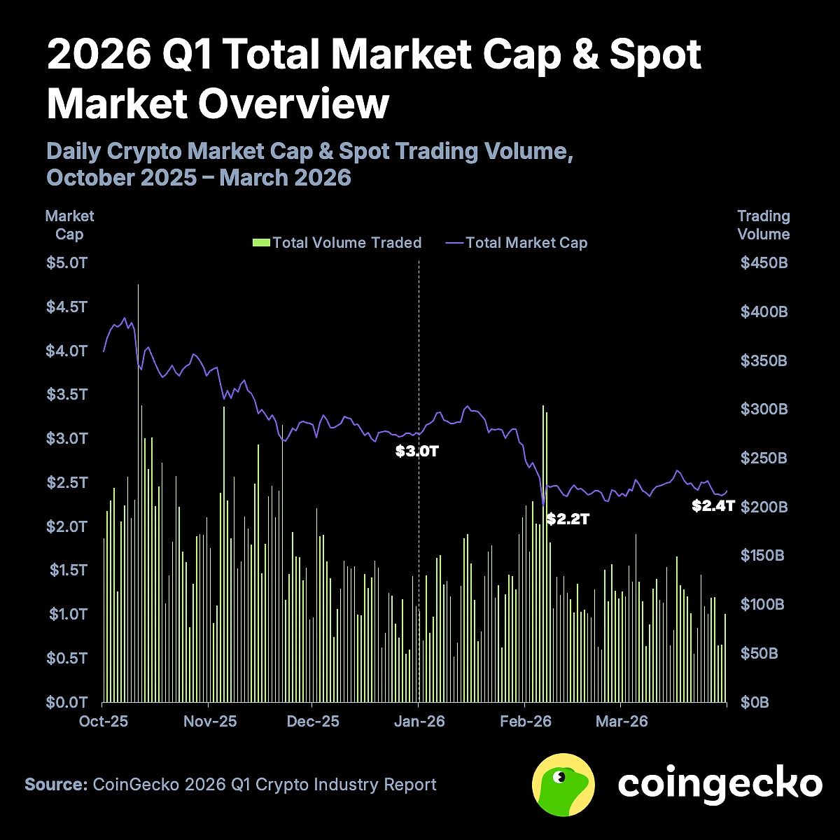 Sepanjang Q1 2026, total kapitalisasi pasar kripto turun sekitar 20,4% secara kuartalan atau setara dengan penurunan sekitar $622 miliar, dan ditutup di kisaran $2,4 triliun. Penurunan paling tajam terjadi pada periode pertengahan Januari hingga awal Februari.
