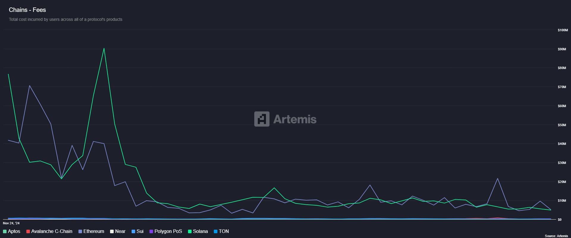 • Biaya transaksi Solana dan Ethereum sempat menembus 90 juta dolar, namun kini turun di bawah 20 juta.