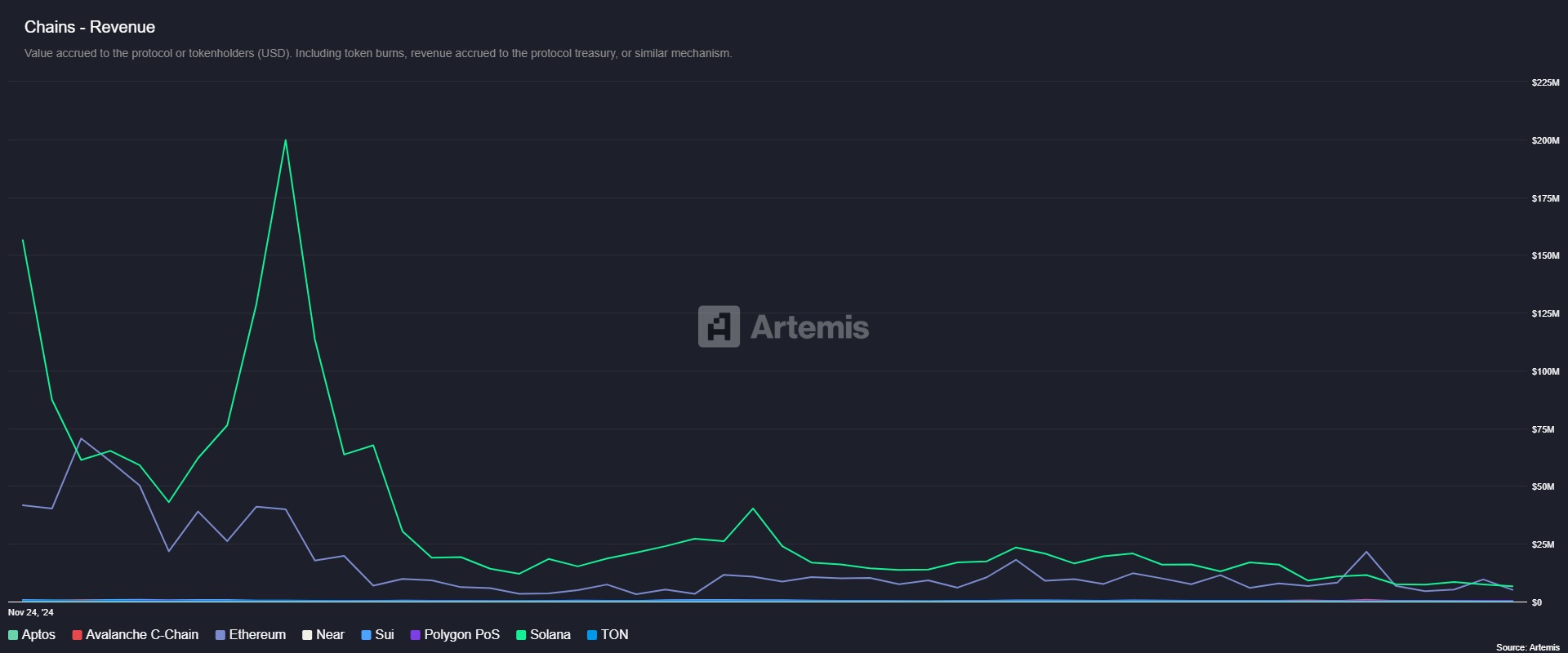 • Revenue Solana sempat mencetak rekor mendekati 200 juta dolar, namun kini pasar bergerak datar di bawah 25 juta dolar.
