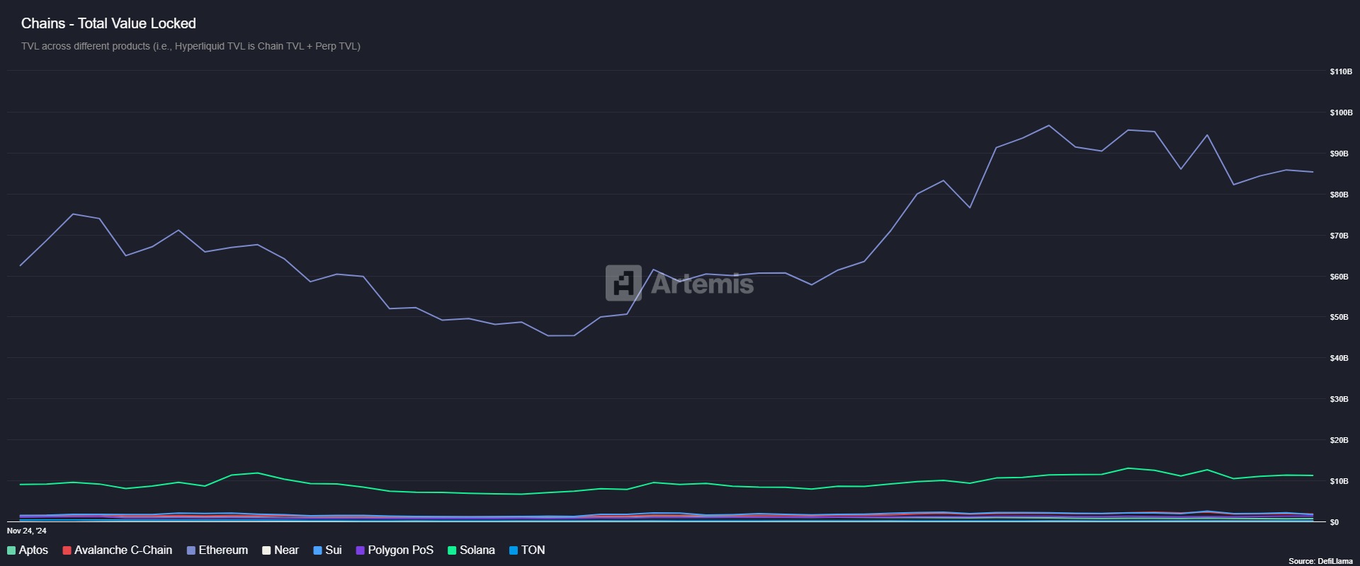 Mendekati 100 miliar dolar, menunjukkan bahwa banyak aset tersimpan meski transaksi tidak sebanyak Solana.