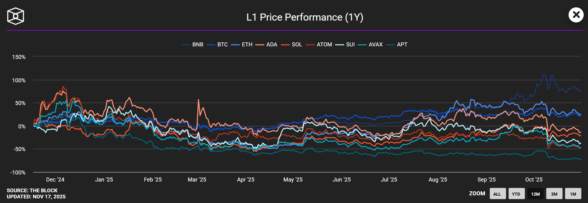 3. L1 generasi lama seperti ADA dan ATOM mengalami stagnasi atau penurunan, menandakan rotasi investor menuju teknologi yang lebih cepat.