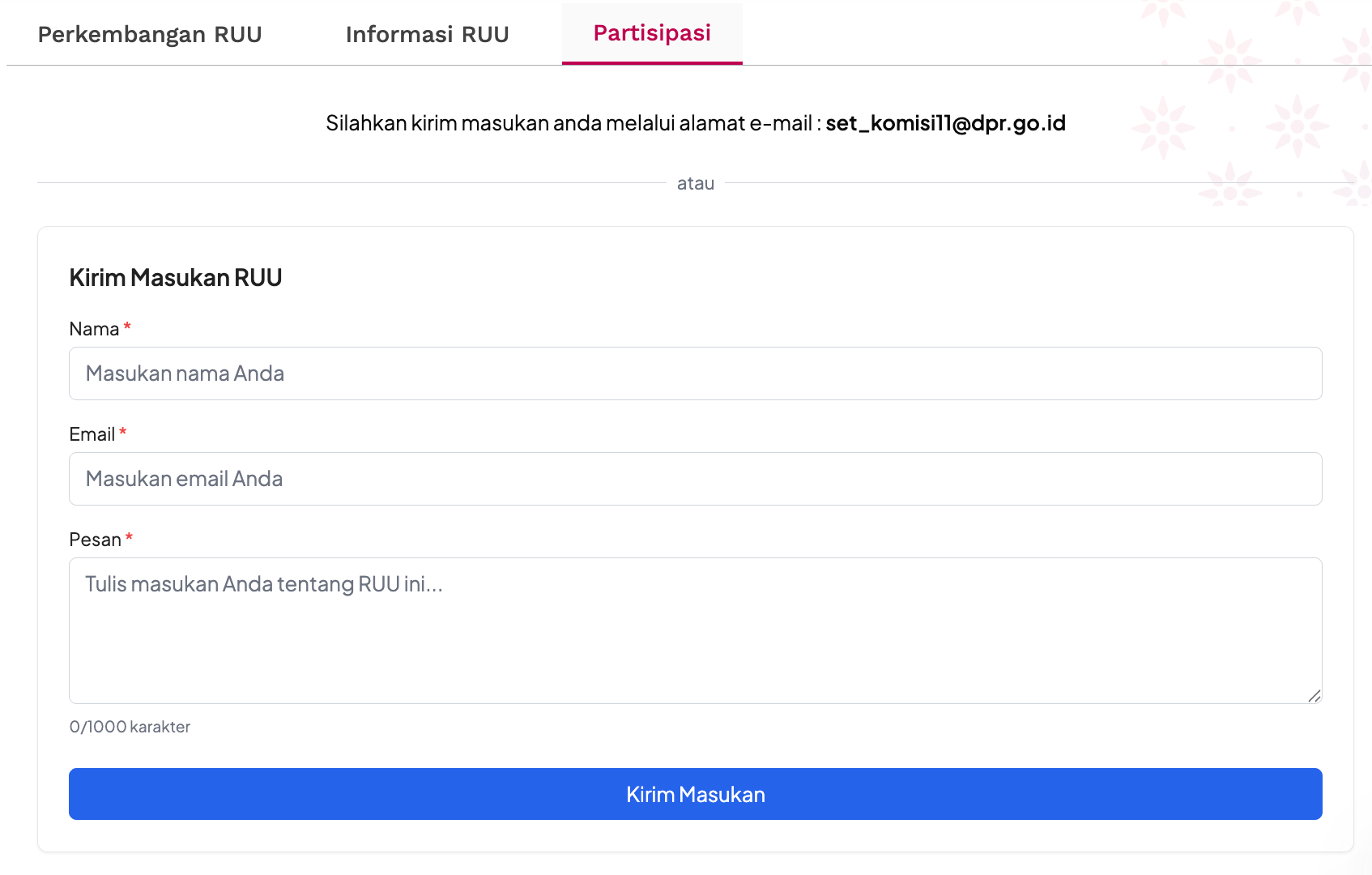Selain itu kamu juga bisa memberikan partisipasi langsung dalam bentuk saran untuk RUU P2SK melalui laman resmi DPR di atas, dengan masuk ke tab “Partisipasi” atau kirim masukkan melalui melalui alamat e-mail: [email protected].