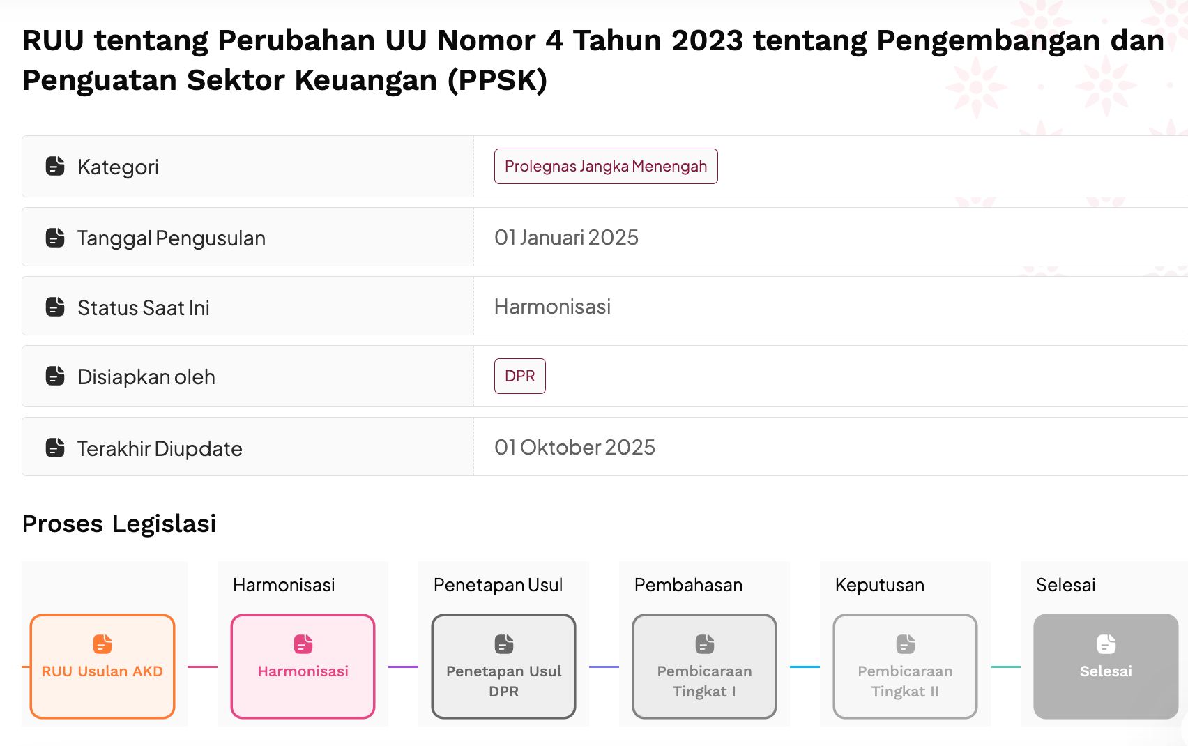 Per Desember 2025, rancangan Undang-Undang Pengembangan dan Penguatan Sektor Keuangan (RUU P2SK) masih berada dalam tahap harmonisasi.