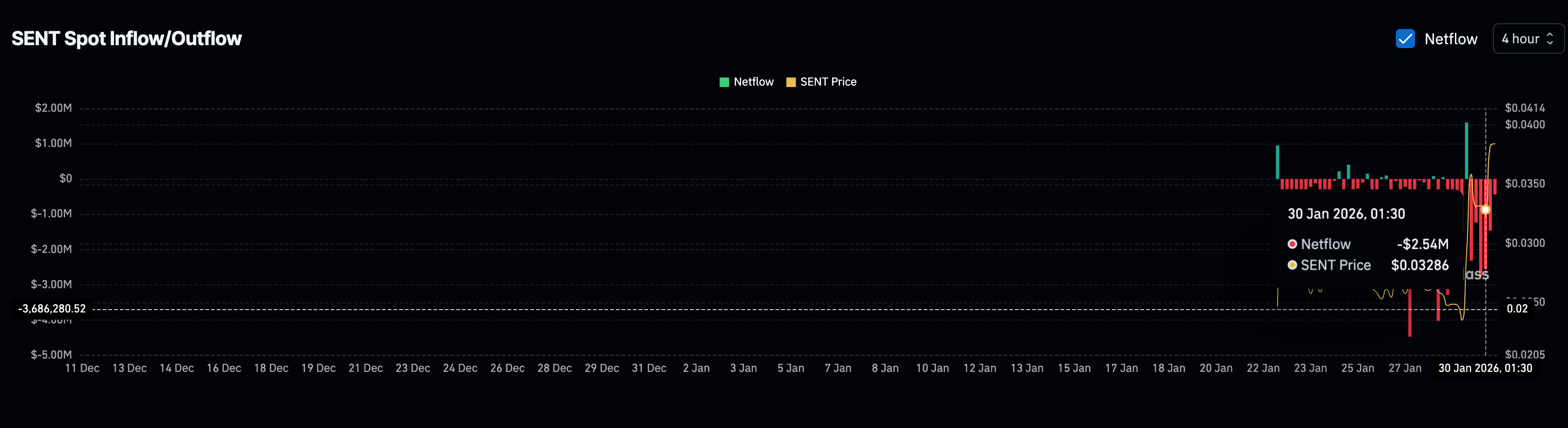 Selain itu, data spot market menunjukkan tekanan jual yang relatif rendah. Sejak peluncuran, arus keluar token dari bursa lebih dominan dibandingkan arus masuk, yang menandakan investor lebih memilih menyimpan aset ketimbang menjualnya. Pada 30 Januari saja, SENT mencatat outflow lebih dari US$4 juta, meski harga sudah berada di level tinggi.