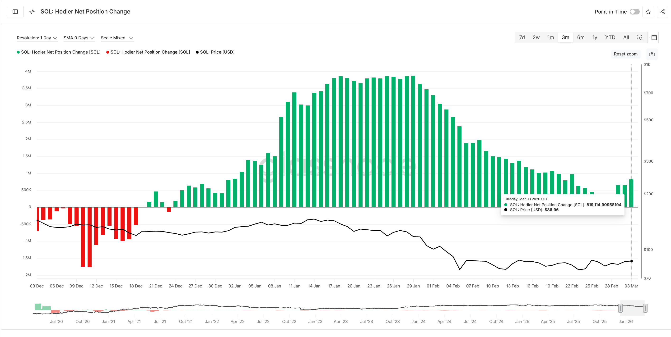 Data on-chain dari Glassnode menunjukkan investor jangka panjang mulai meningkatkan akumulasi. Metrik Hodler Net Position Change menunjukkan peningkatan posisi dari sekitar 642.906 SOL menjadi 819.114 SOL antara 1 hingga 3 Maret.