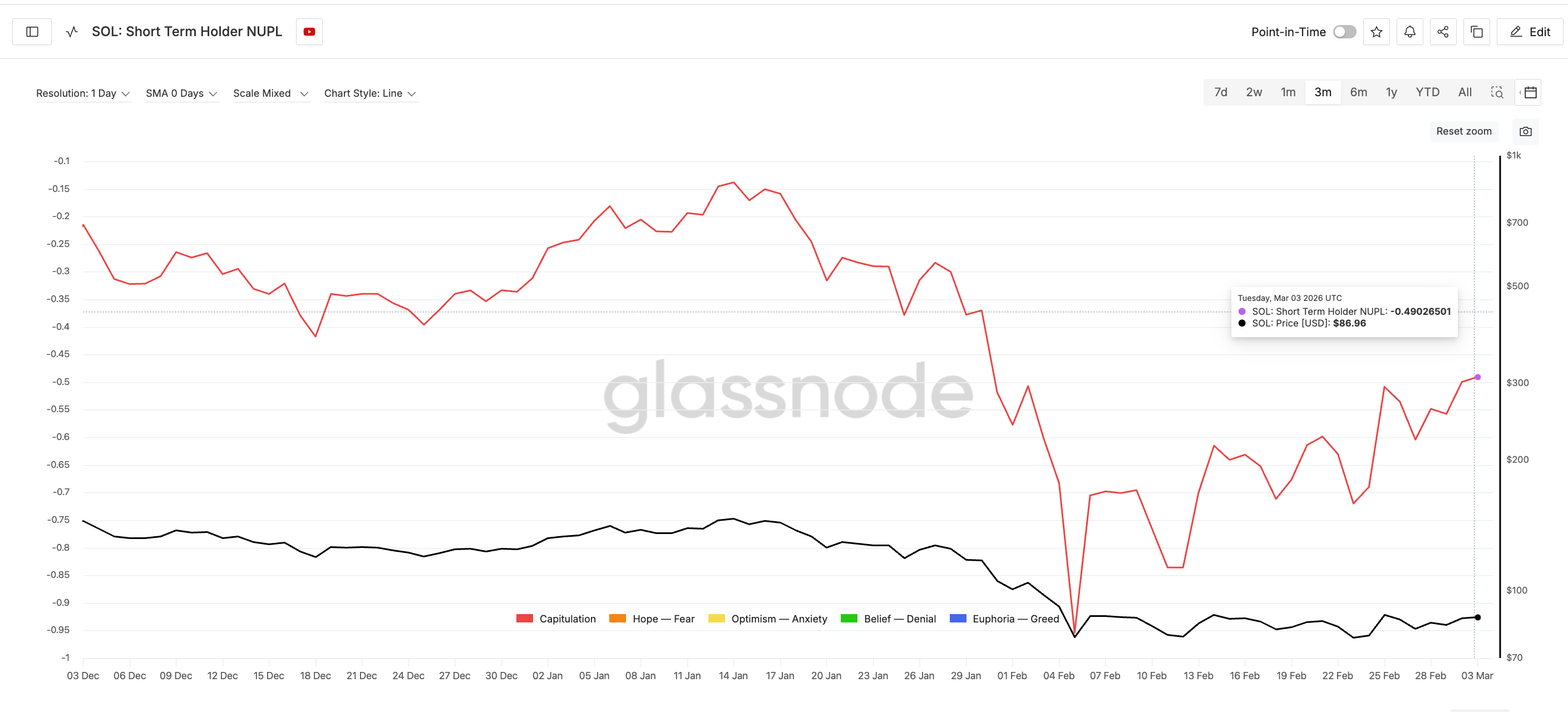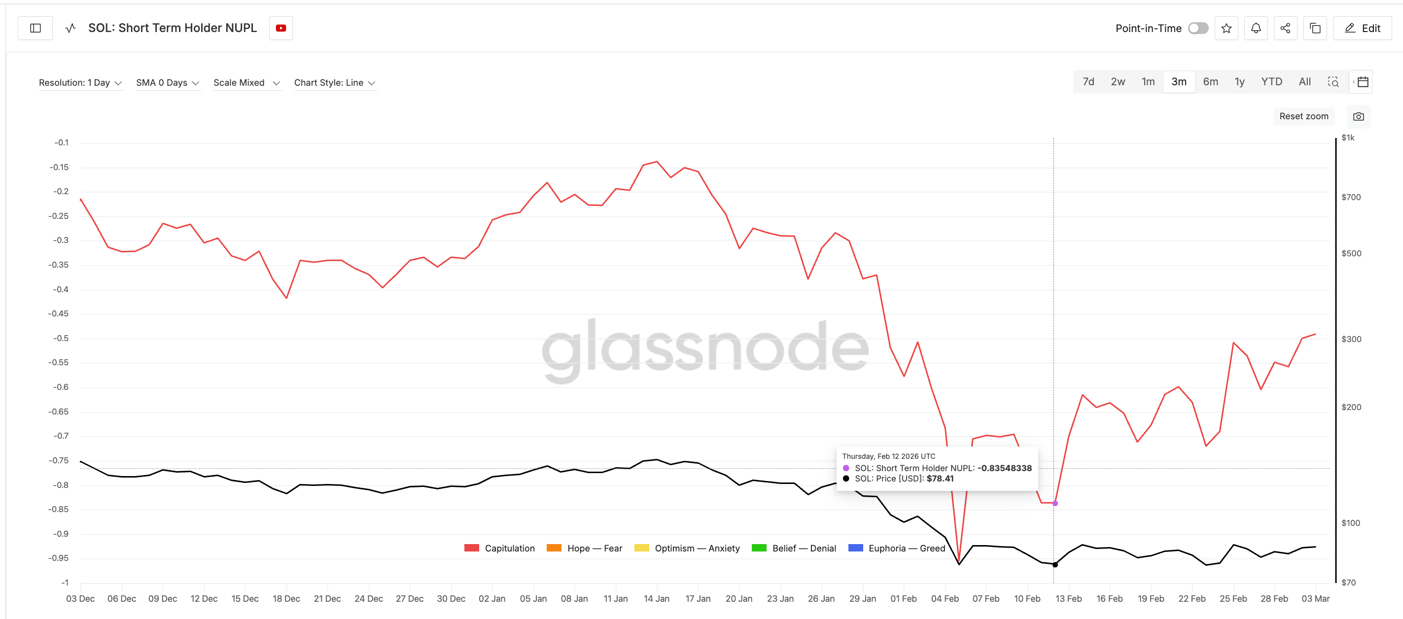 Contoh serupa terjadi pada 24 Februari ketika NUPL mencapai sekitar -0,50 dan harga Solana berada di US$88. Dalam tiga hari berikutnya, harga turun sekitar 7%.