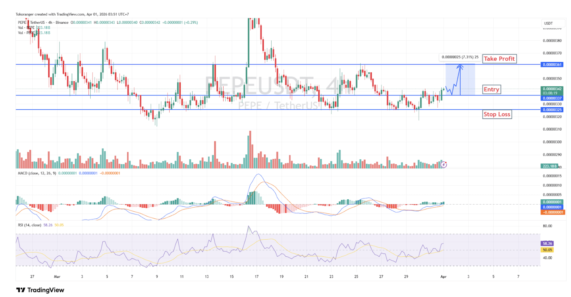 PEPE/USDT saat ini berada di fase penentuan tren dengan pola lower high, namun ada indikasi penguatan dari MACD yang perlahan naik dan RSI di 57 yang menunjukkan demand mulai meningkat. Entry di 0.0000337, stop loss di 0.0000325, dan target take profit di 0.0000361 (±7.3%).