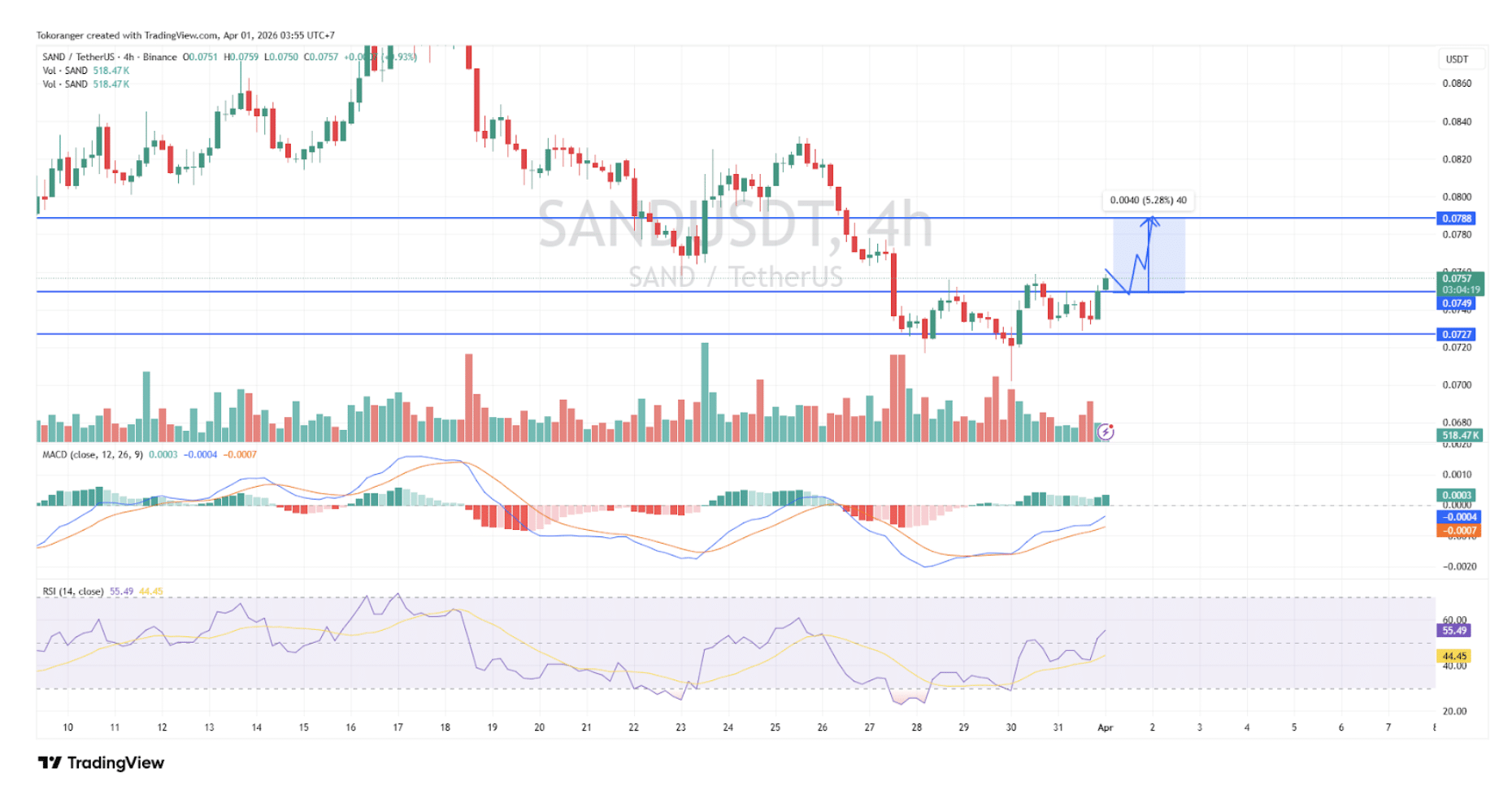 SAND/USDT masih dalam tren bearish (lower high), namun mulai menunjukkan potensi reversal dengan MACD yang menguat dan RSI di 55 yang menandakan tekanan buyer meningkat. entry di 0.0749, stop loss di 0.0727, dan target take profit di 0.0788 (±5.28%).
