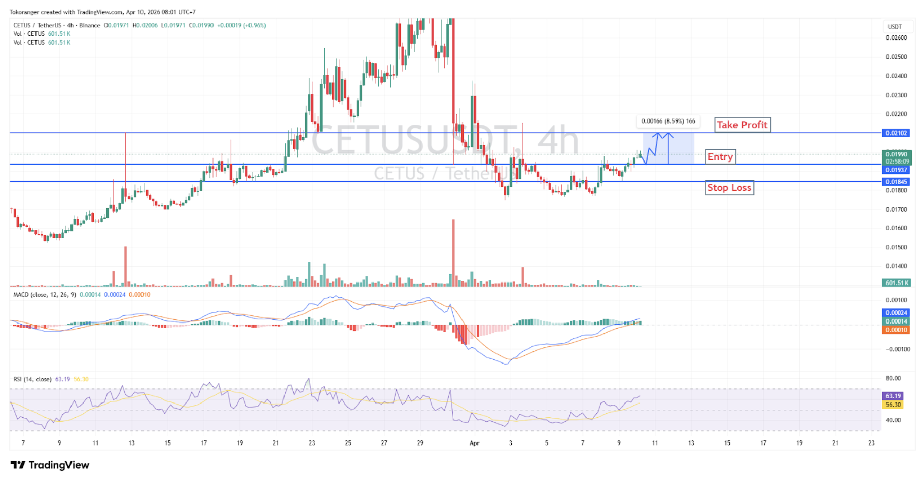CETUS saat ini kondisi masih bullish, terlihat dari MACD yang sudah positif dan RSI yang naik di kisaran 56-62, menandakan momentum beli mulai terbentuk.