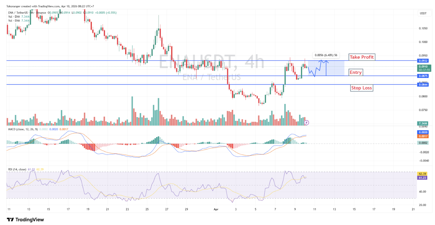Di timeframe 4 jam, kondisi ENA masih terlihat bullish dengan MACD yang berpotensi lanjut menguat, meskipun histogram mulai mengecil yang menandakan momentum agak melambat. RSI di sekitar 60 juga mengonfirmasi tren naik masih cukup sehat dan belum ada tanda koreksi besar.