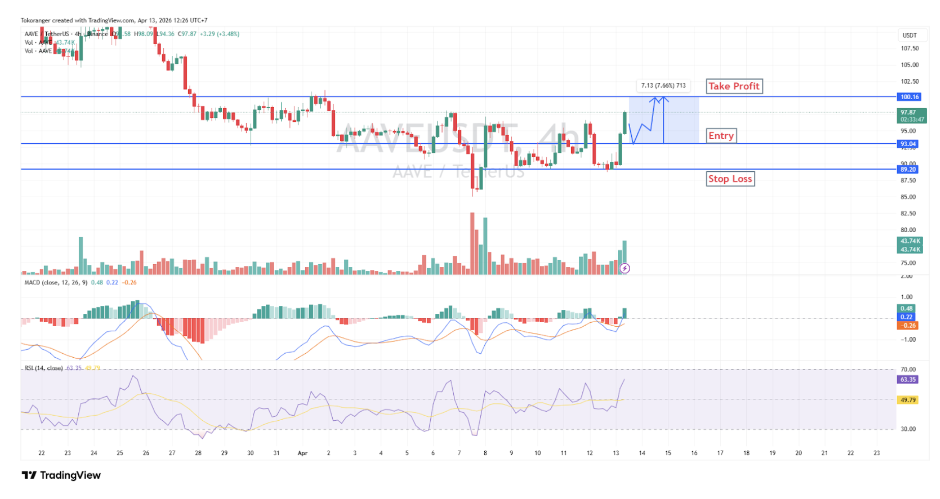 AAVE/USDT dalam kondisi breakout dengan potensi bullish lanjutan, didukung oleh peningkatan volume yang cukup stabil serta RSI di sekitar 63 yang menunjukkan dominasi buyer.