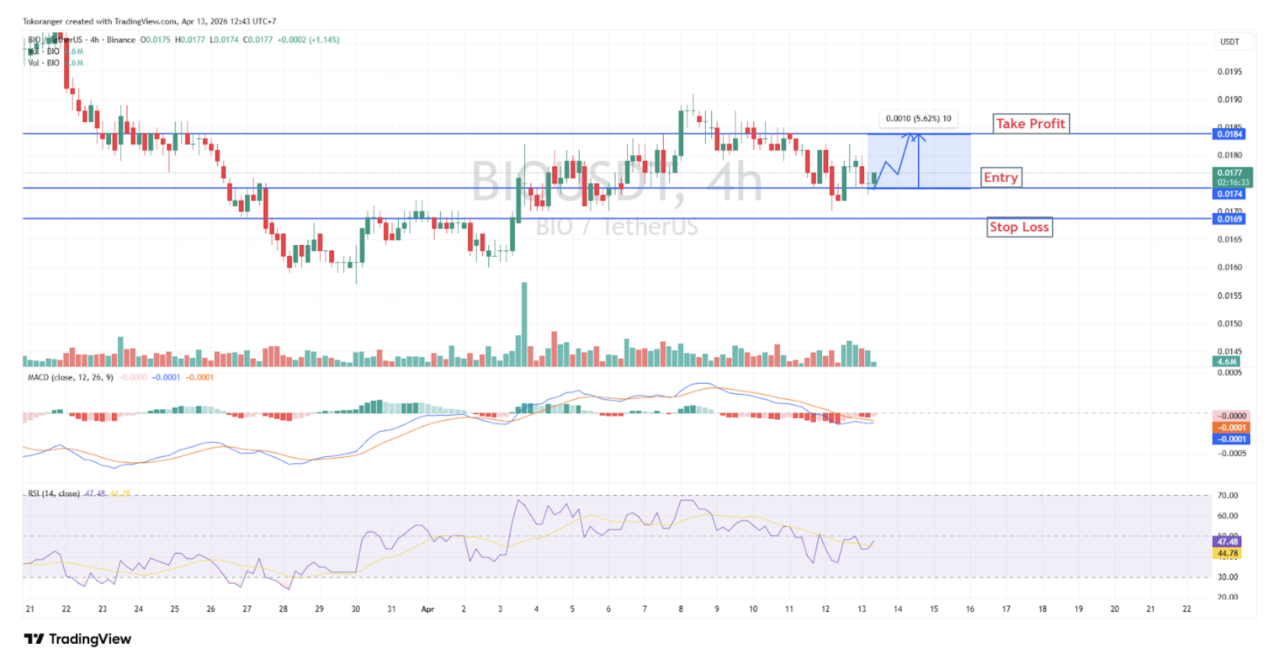 BIO/USDT dalam kondisi sideways dengan kecenderungan bearish ringan, terlihat dari MACD yang mulai masuk ke area negatif serta RSI di sekitar 44 yang menunjukkan tekanan jual masih dominan.