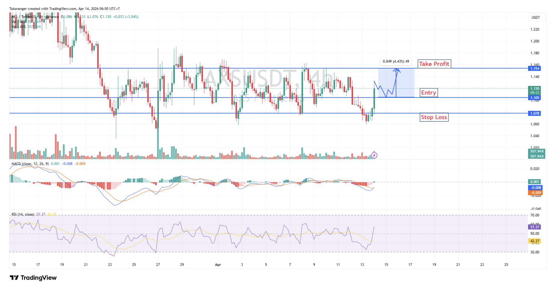 AXS/USDT saat ini menunjukkan tanda reversal dengan harga yang sedang melakukan retest area resistance dan berpotensi membentuk support baru di sekitar 1.105. Indikator mendukung, di mana MACD mulai crossing up, RSI mengalami peningkatan, serta volume yang naik menandakan mulai adanya akumulasi buyer. Entry di 1.105, stop loss di 1.078, dan target 1.154, terdapat potensi kenaikan sekitar 4.43%