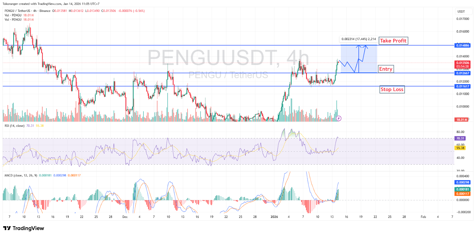 Kondisi ini juga dikonfirmasi oleh volume transaksi yang relatif tinggi, menandakan minat market sedang meningkat. Dengan struktur ini, PENGU berpotensi melanjutkan kenaikan menuju target 0,014886, dengan area entry di 0,012667 dan stop loss di 0,011617, selama support tetap terjaga.