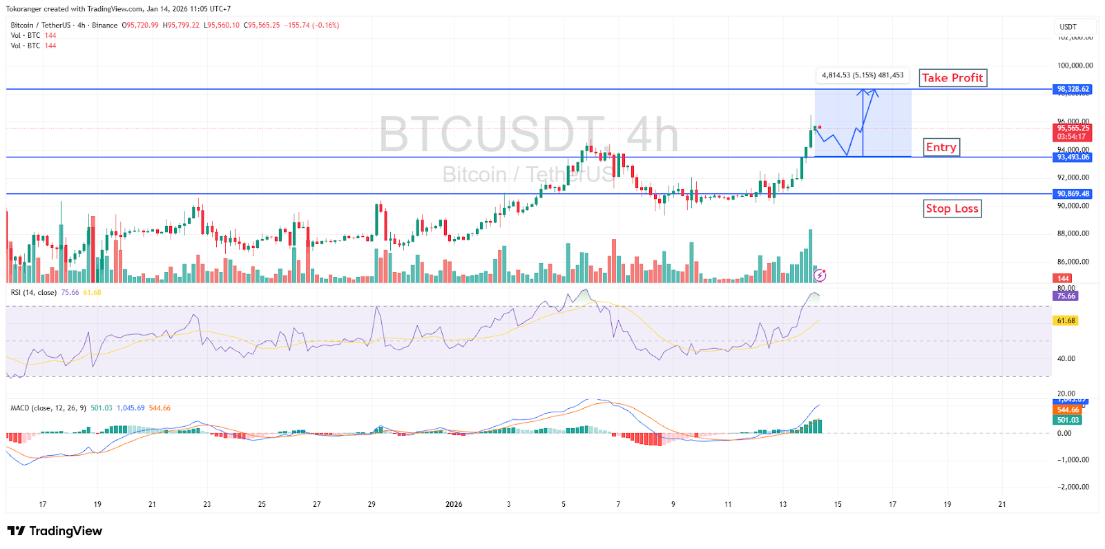 Namun tetap perlu waspada karena RSI sudah masuk area overbought di sekitar 76, sehingga potensi koreksi jangka pendek tetap terbuka, apalagi Bitcoin juga sedang berada di area resistance psikologis. Untuk skenario trading, area entry berada di 93.493, stop loss di 90.869, dan take profit di 98.328 dengan potensi kenaikan sekitar 5,15%, sambil tetap menjaga manajemen risiko jika terjadi pullback.