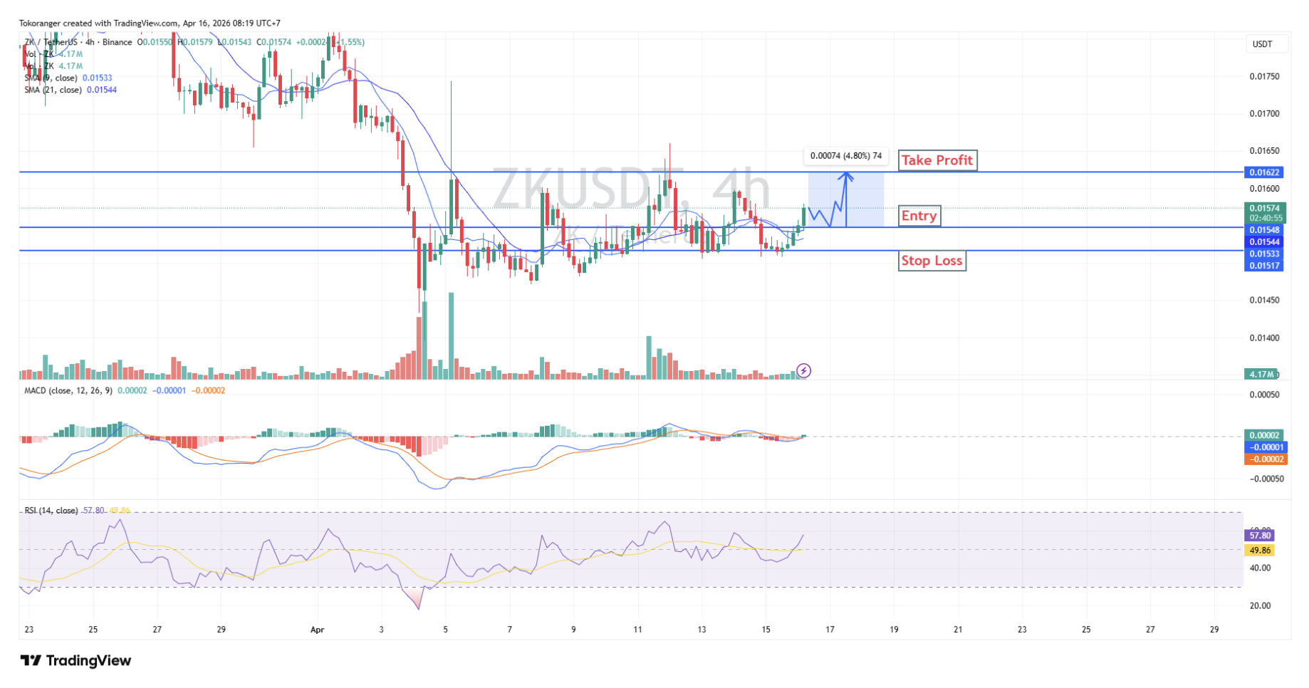 ZK mulai menunjukkan sinyal positif dengan golden cross pada MACD yang didukung peningkatan volume dan RSI.