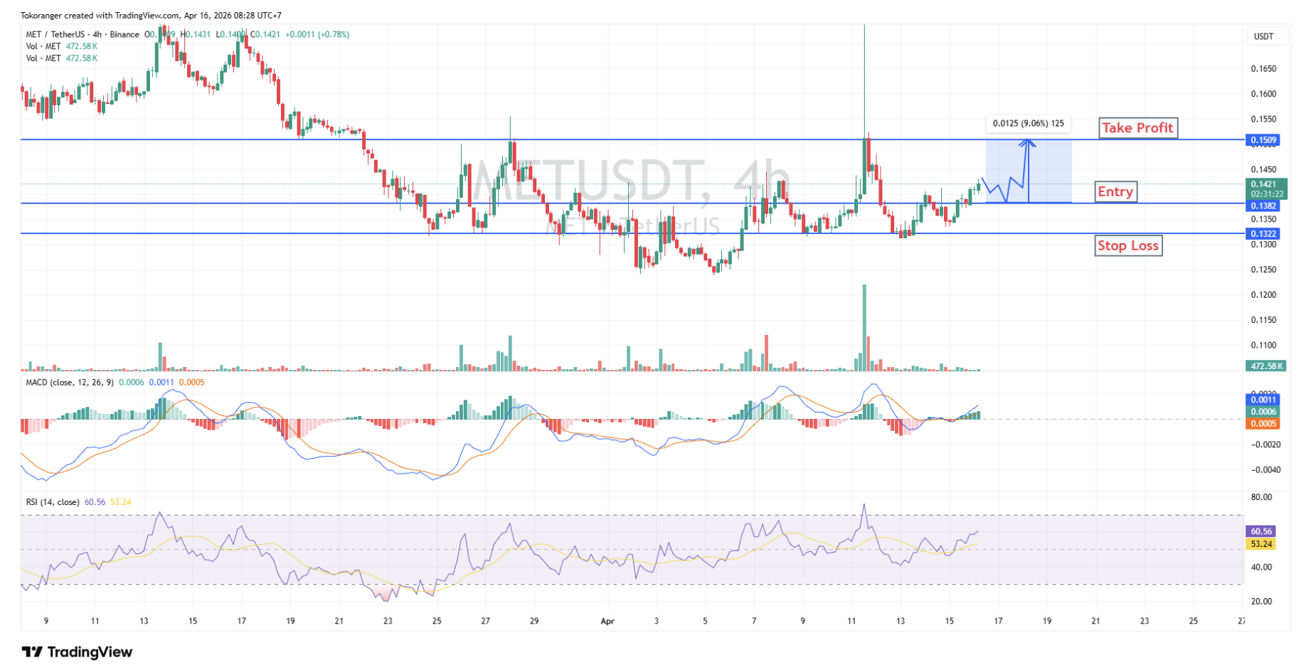 MET/USDT pada timeframe 4H menunjukkan kecenderungan bullish dengan indikator yang mulai menguat di area positif, didukung RSI yang terus naik dan volume yang relatif stabil. Struktur harga saat ini memberi peluang lanjutan kenaikan selama mampu bertahan di area support. Setup yang bisa diperhatikan ada di entry 0,1382 dengan target 0,1509 dan stop loss di 0,1322.