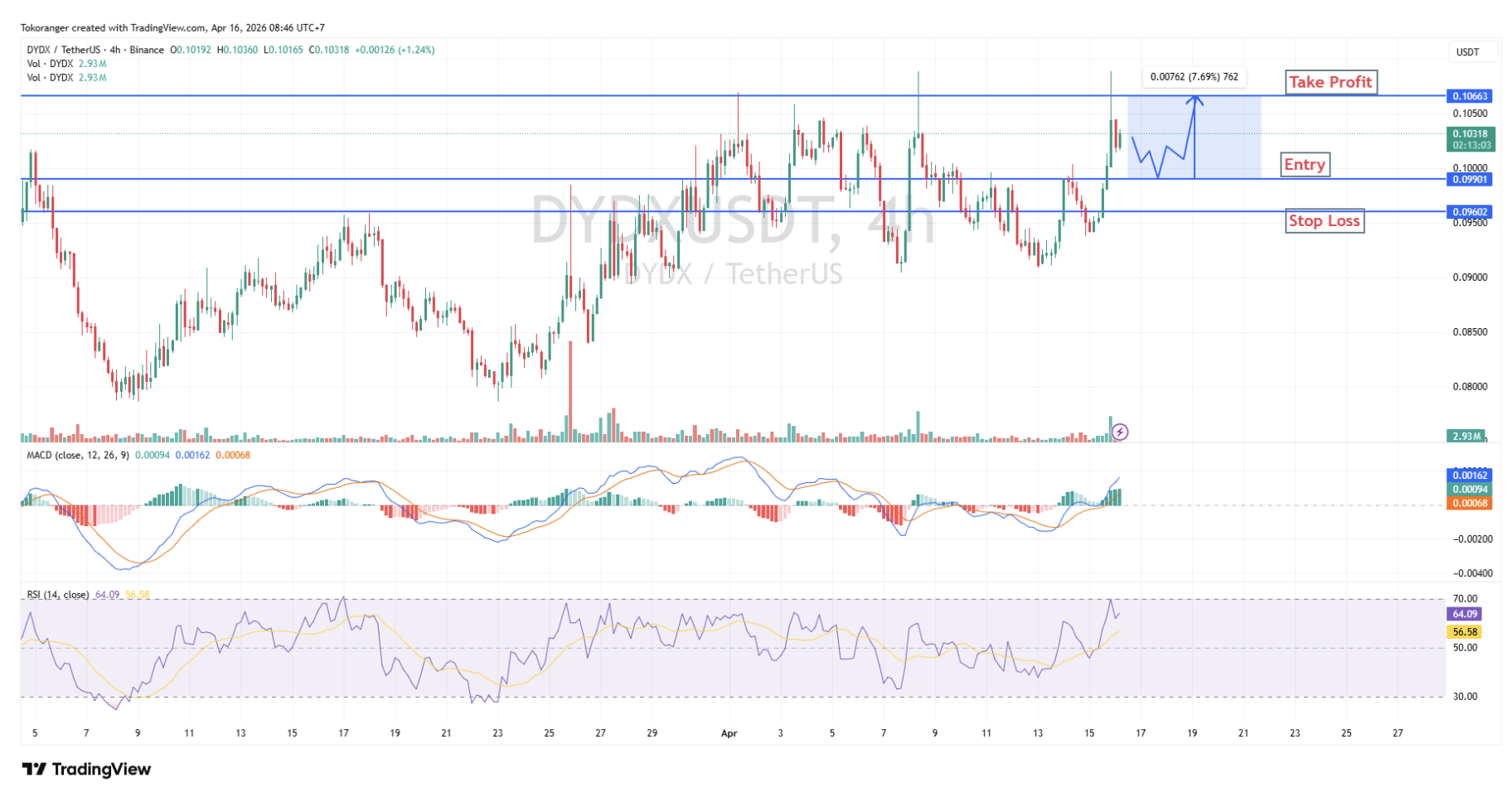 DYDX/USDT saat ini berada dalam momentum bullish setelah breakout, dengan dukungan MACD yang menguat dan RSI di area 60-an yang masih sehat. Volume yang mulai meningkat juga mengindikasikan adanya minat beli yang cukup konsisten. Entry 0,09901, harga berpotensi melanjutkan kenaikan ke 0,10663 dengan batas risiko di 0,09602.