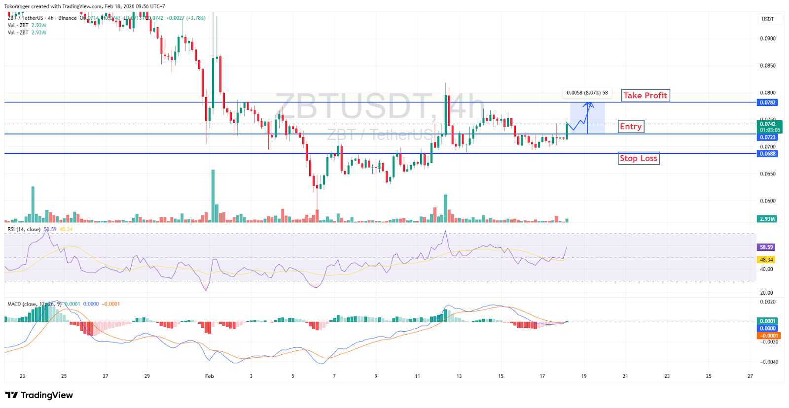 ZBT/USDT saat ini mulai menunjukkan indikasi awal bullish yang tercermin dari MACD golden cross, histogram berubah hijau, serta momentum yang bergerak menuju area positif, meskipun volume sedikit menurun sehingga konfirmasi tren naik masih terbatas.