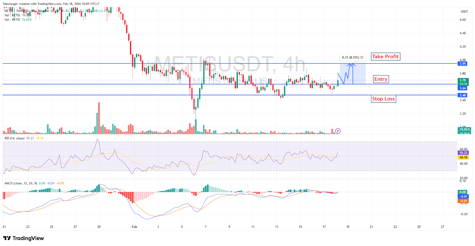 METIS/USDT pada timeframe 4 jam masih berada dalam fase sideways yang cukup panjang, tercermin dari MACD yang bergerak di sekitar garis nol sehingga tren belum terkonfirmasi bullish maupun bearish.