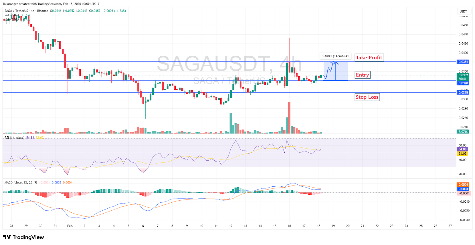 SAGA/USDT pada timeframe 4 jam saat ini masih bergerak dalam fase konsolidasi cenderung sideways dengan kecenderungan bullish ringan, terlihat dari RSI yang bertahan di atas area 50 serta MACD yang masih berada di zona positif meski mulai melandai, menandakan momentum kenaikan belum sepenuhnya kuat namun tetap terjaga.