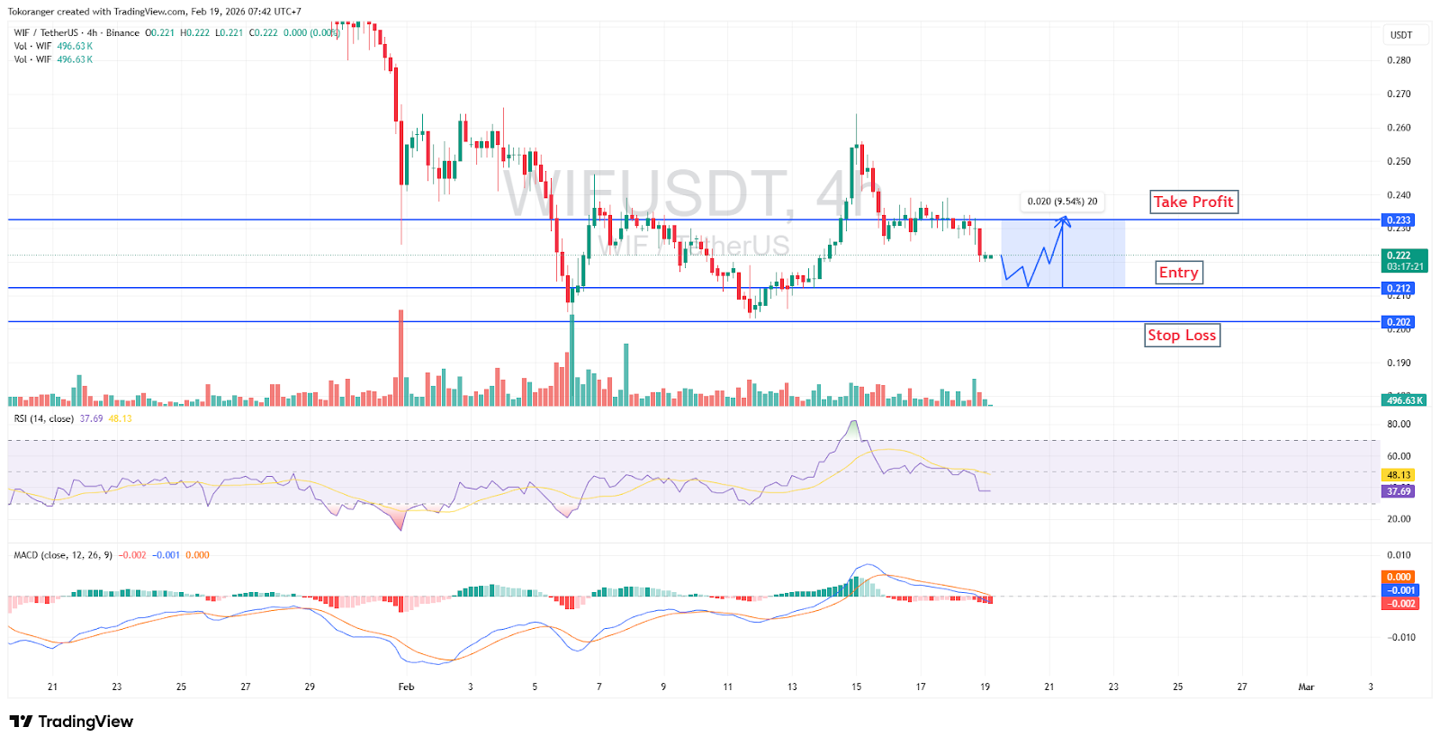 WIF/USDT pada timeframe 4 jam saat ini berada di mid-range konsolidasi dalam struktur tren mingguan yang masih lebar. Momentum jangka pendek terlihat melemah karena MACD mulai bergerak ke zona negatif dengan histogram merah tipis, sementara RSI turun ke area 40-an yang menandakan tekanan jual ringan namun belum masuk fase bearish kuat.