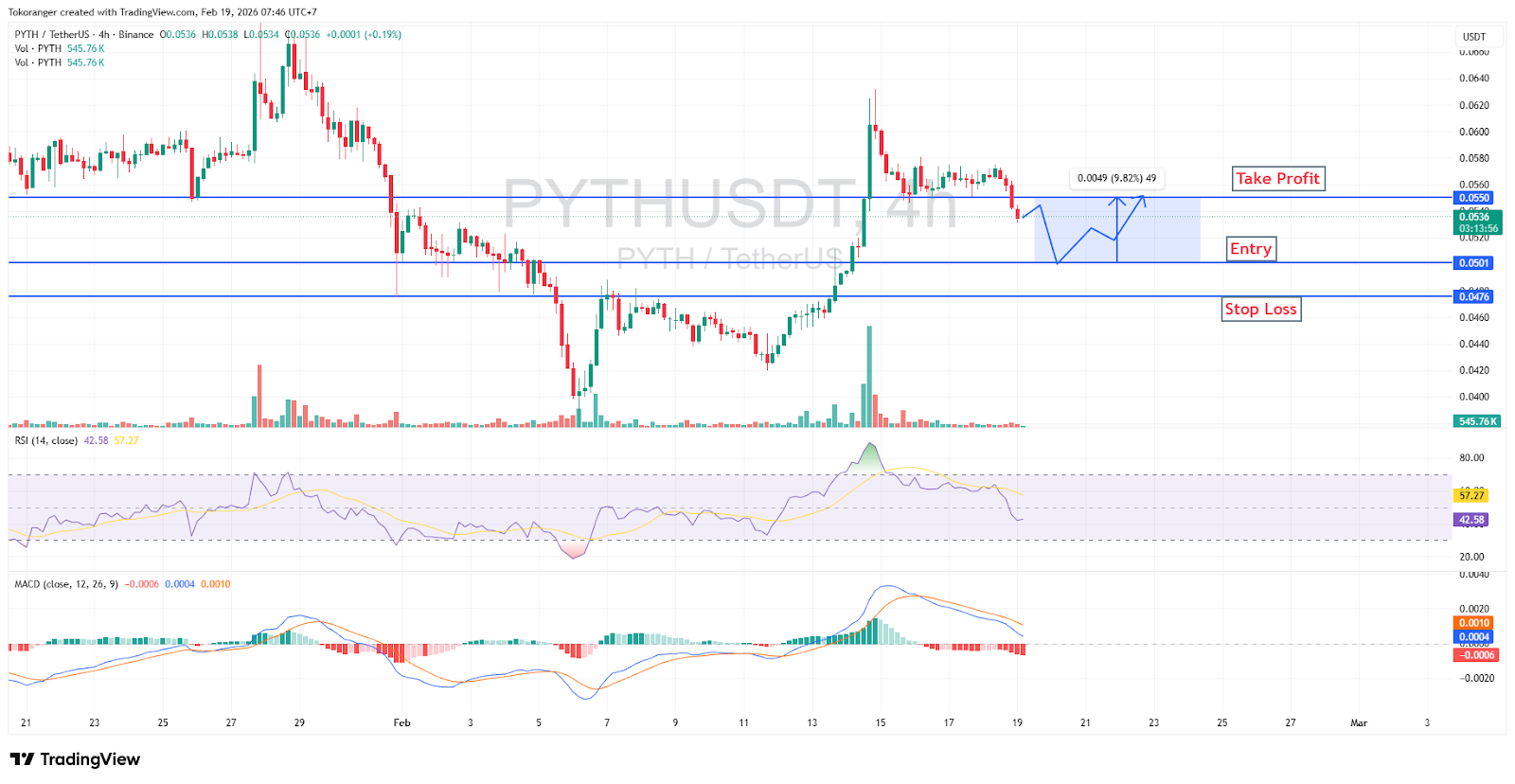 PYTH/USDT pada timeframe 4 jam masih berada dalam fase koreksi setelah kenaikan sebelumnya, terlihat dari RSI yang melemah ke area 40–45 dan MACD yang mulai bergerak negatif sehingga momentum bullish mereda dan pasar cenderung konsolidasi.