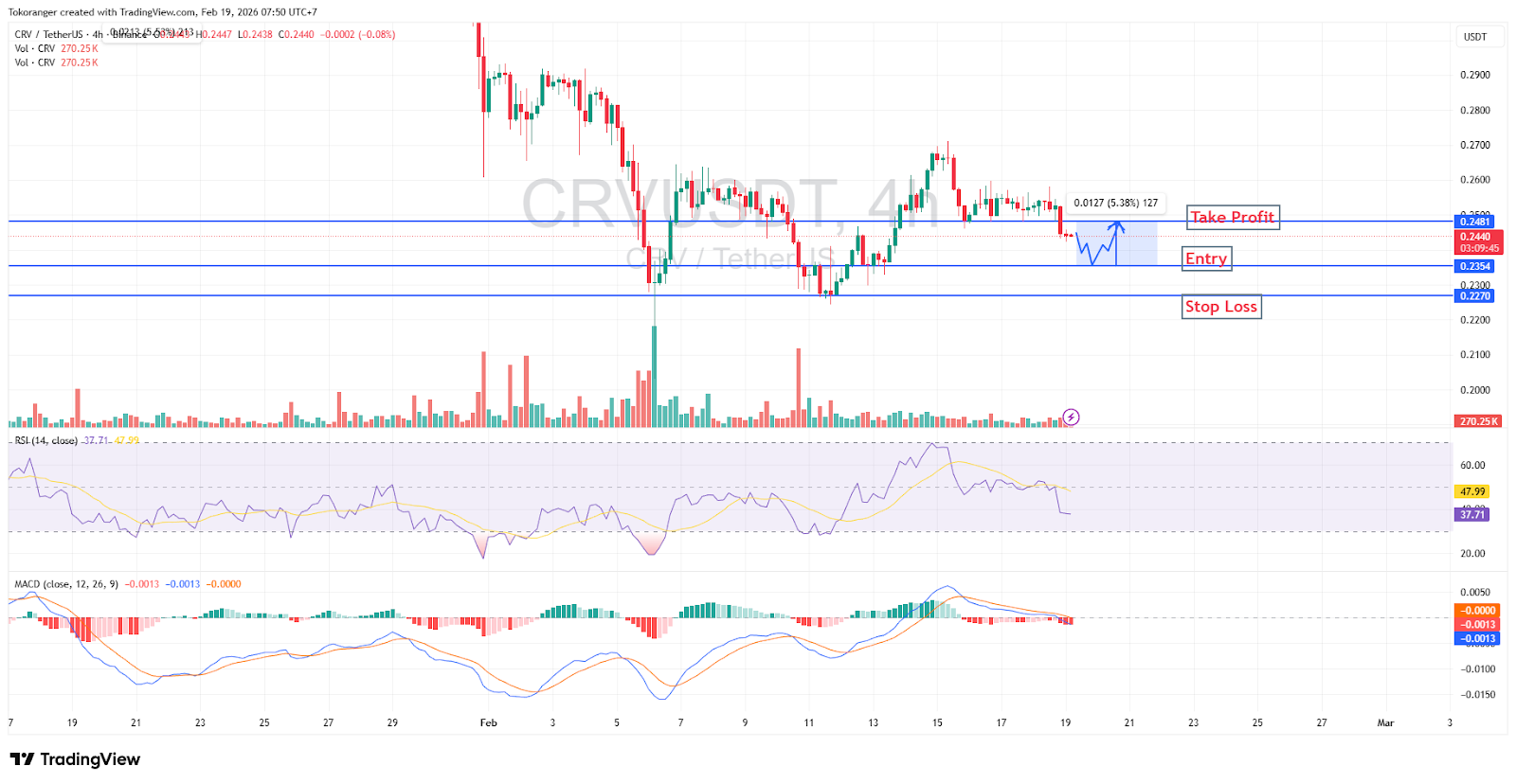 CRV/USDT pada timeframe 4 jam terlihat masih bergerak dalam fase konsolidasi setelah pelemahan sebelumnya, dengan RSI turun ke area sekitar 40 yang menandakan momentum beli melemah dan MACD yang kembali negatif mengindikasikan tekanan bearish jangka pendek masih dominan.